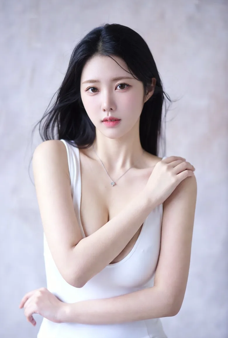 她有时把长发披散,像午夜泼洒的墨,让白更显沉默;有时随意挽起,露出后颈那片最易受伤也最易被亲吻的弧度。手臂轻抬,指尖无意识地掠过锁骨,像在确认自己是否还完整地属于这个瞬间。光从很高很远的地方来,不带任何锐角,像是被谁用砂纸反复打磨过的旧银器,反射时只剩下温度。影子因此变得稀薄,几乎要融化在墙面里,只留下她身体最轻微的隆起与凹陷,作为唯一可被阅读的语言。