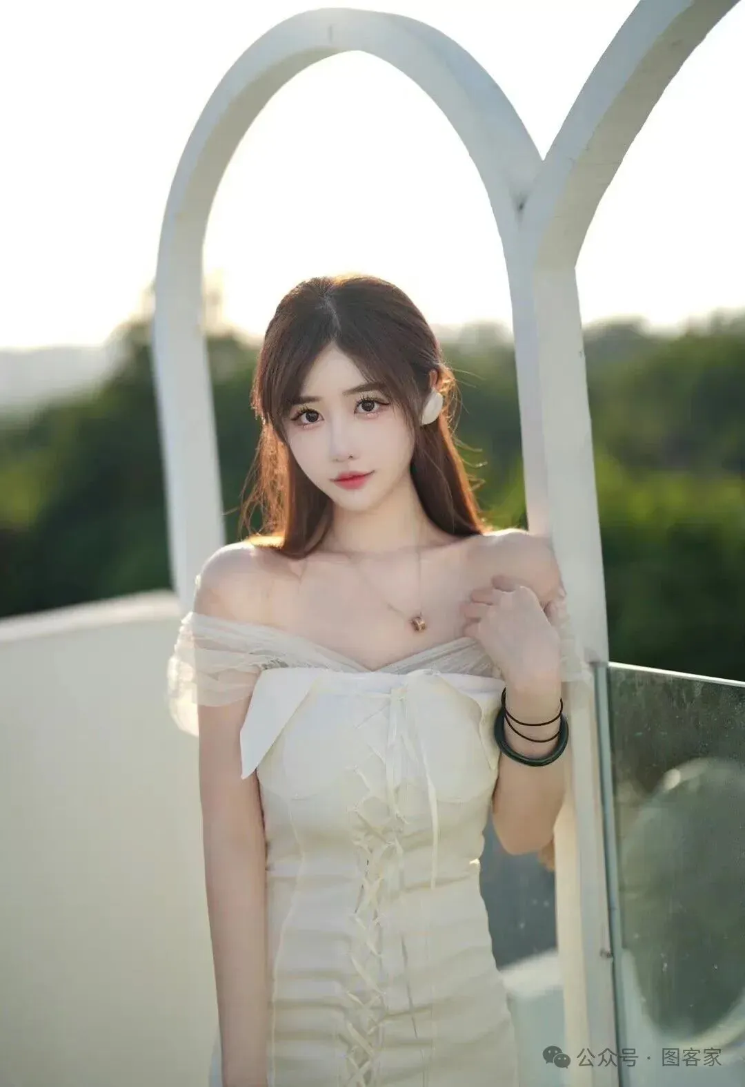 她穿着一件简约的白色连衣裙,裙摆刚好到膝盖上方,清新而又俏皮。裙子的材质是柔软的棉质,随着她的动作轻轻摆动,散发着自然的气息。领口处点缀着一圈精致的蕾丝花边,为她增添了几分甜美。