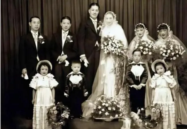 这张叫婚礼照,纱是法式的,长到拖地,胸前一抱就是满怀栀子花,四个花童站台阶一样排着,奶奶看见这张就爱感叹,以前结婚没有网红跟拍,没有航拍,咯,一台哈苏就把一辈子的好看定住了,现在婚礼节目多,回头翻相册,真能打的还是这味儿的黑白片子。