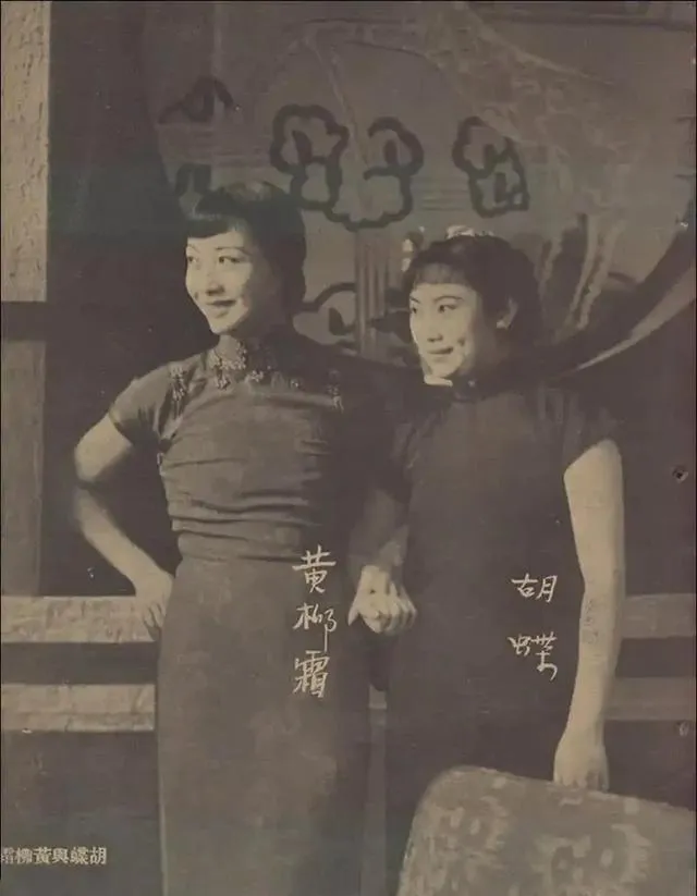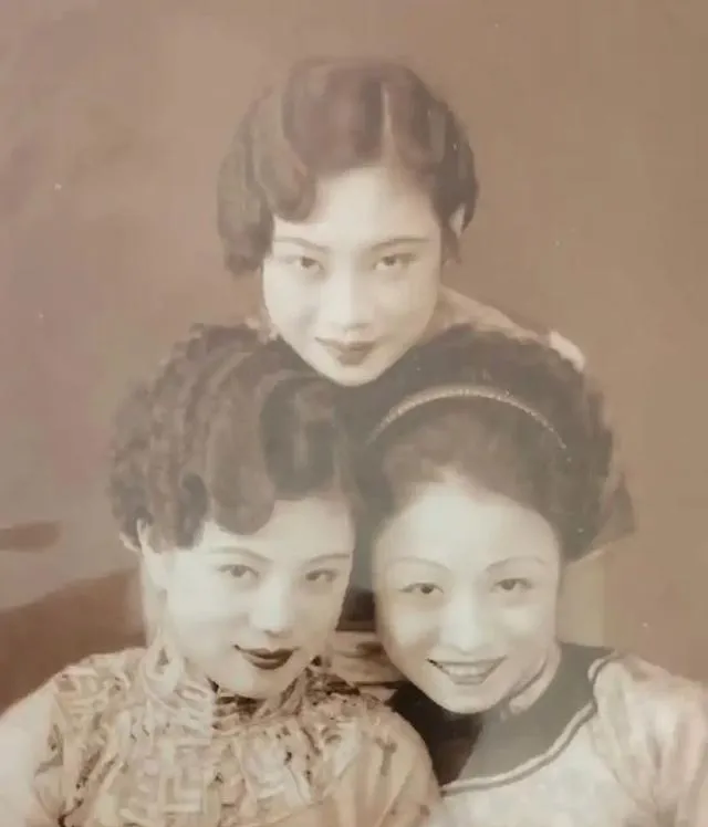 这张老法师爱玩层次,胡蝶在上,底下两位姐妹笑露牙尖,眉线细得像一笔挑上去,照片边角起毛了,气儿还在,像戏院里幕布刚起那一下子。