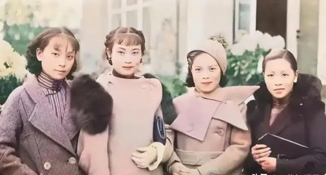 呢子大衣扣得严,裘领压在肩上,姿态各不相同,最右那位手里夹着一本小册子,像刚从片场的日程表里走出来,紧紧忙忙的,却还是要合影留念。