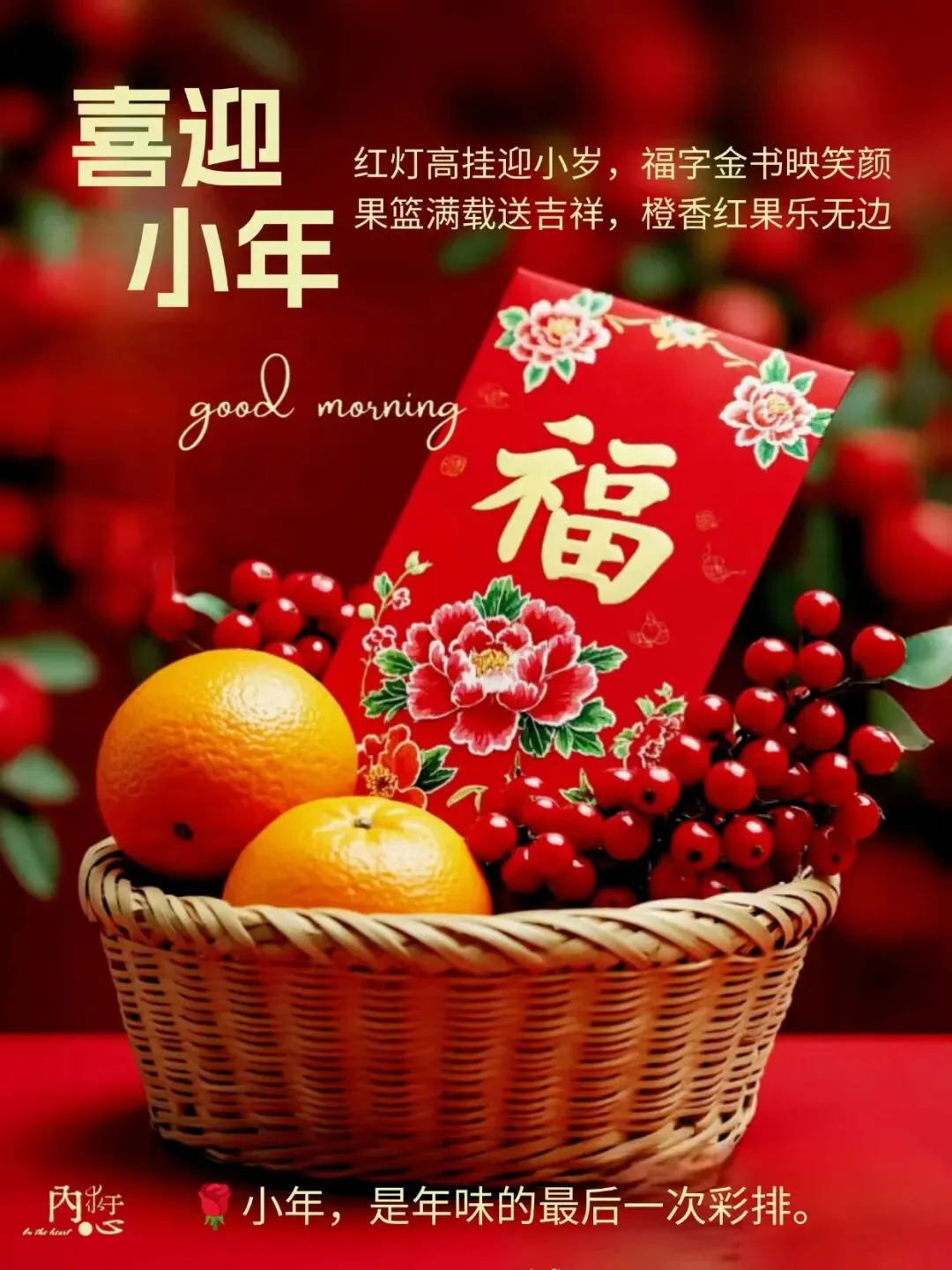 ❤️😊🍎🎉南方小年喜临门,红火鞭炮声喧响,团圆饺子店里香,合家欢庆笑声长,愿你幸福似花香,吉祥如意紧相随。早安,今日是南方小年!