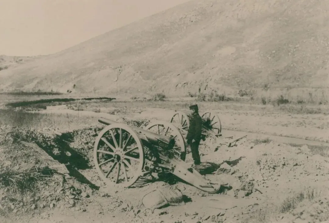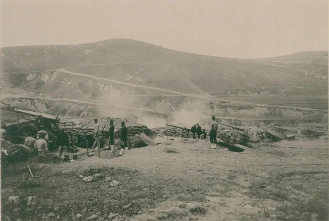 日军步兵炮兵第三联队,在王家甸南方149高地北麓发起的炮击。1904年10月1日上午11点15分,图片上半部分的山顶是149高地,炮兵正从那里向东鸡冠山的堡垒发起攻击。