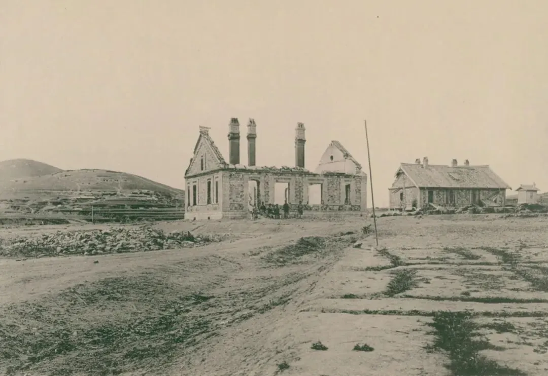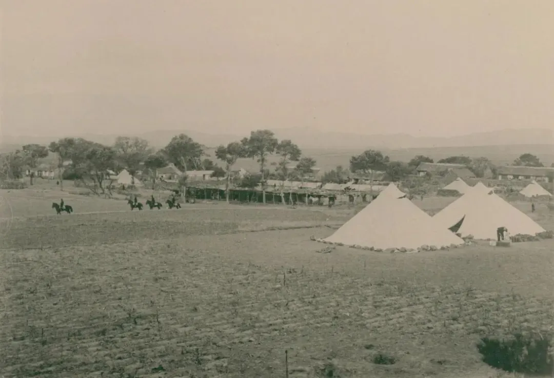 1904年10月9日上午9:35分,位于柳树房(长城街道柳树房村)的日军第三军司令部。上部最右侧的房子,是司令官乃木希典及其参谋长的住处。