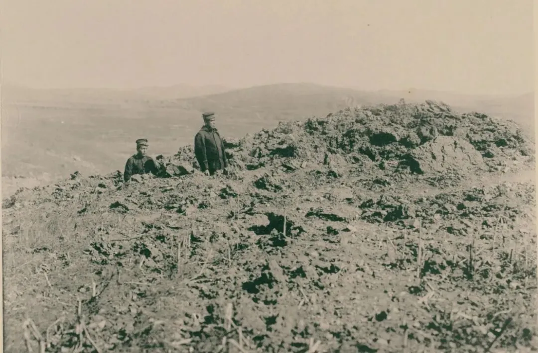 王家甸西方的洼地中,俄军炮击后造成的弹坑。弹坑最大直径为6米,最小直径为4.5米。由于附近是一片软土地,几乎没有大石头,所以弹坑特别大。据说这些炮弹是俄军 33厘米舰炮发射的。1904年10月4日,午后2:50分。