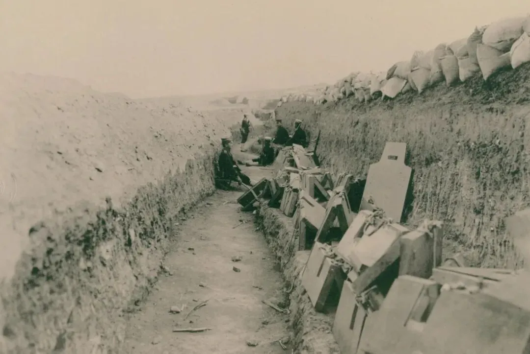 东鸡冠山北堡垒前的日军战壕中,步兵的阵地与盾牌。旁边堆放的是普通盾牌和士兵在进攻时使用的卧射防御盾牌。