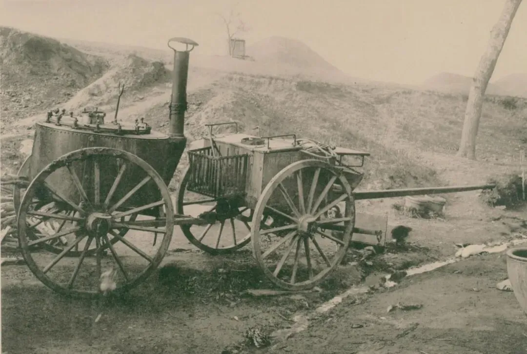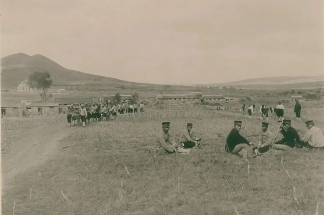 1904年10月1日上午10点45,日军炮兵在王家甸(龙头街道王家村)西南洼地,为28厘米榴弹炮装填炮弹。