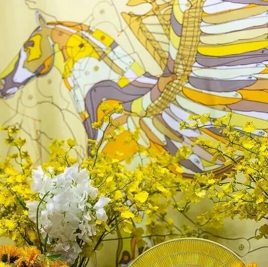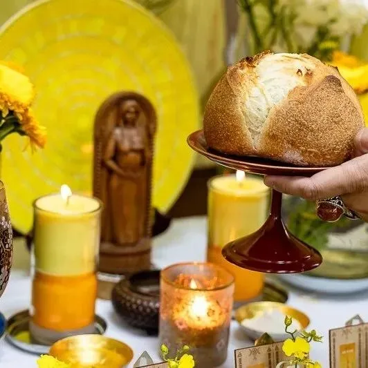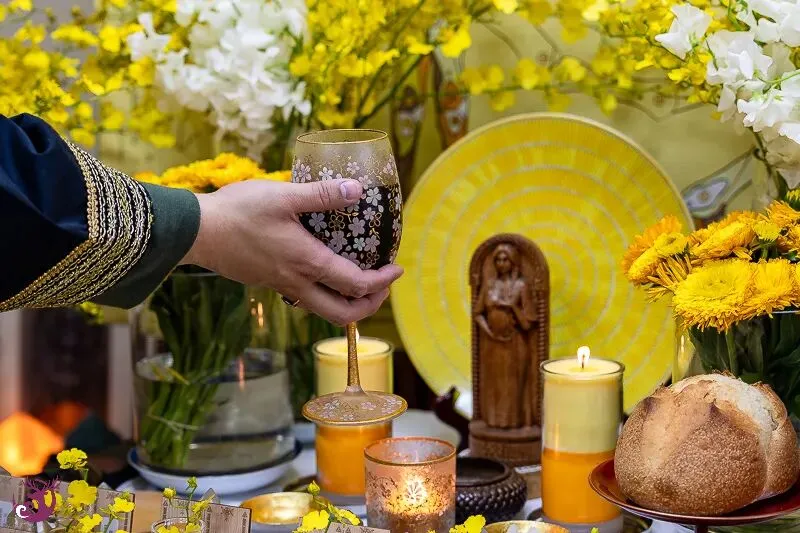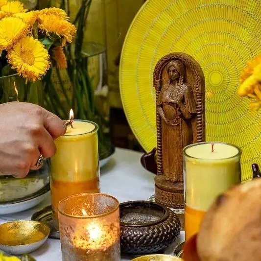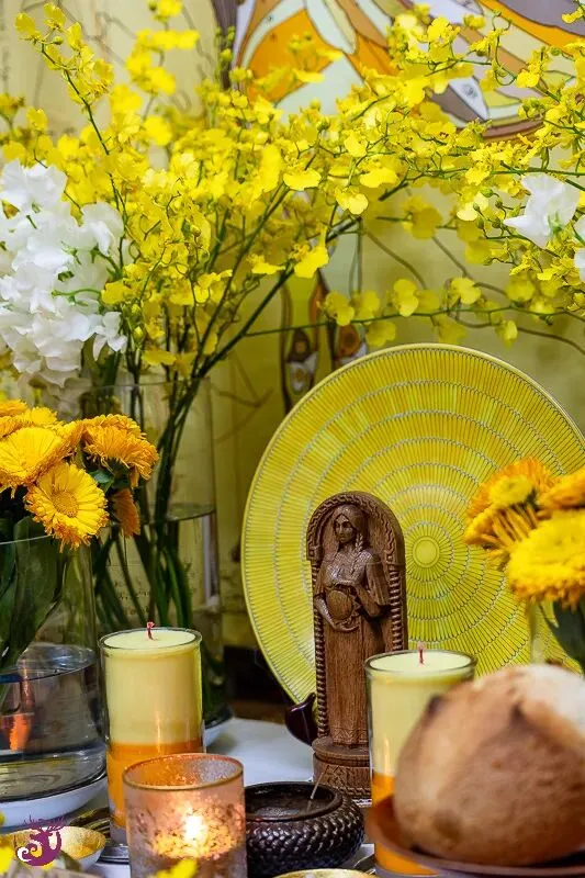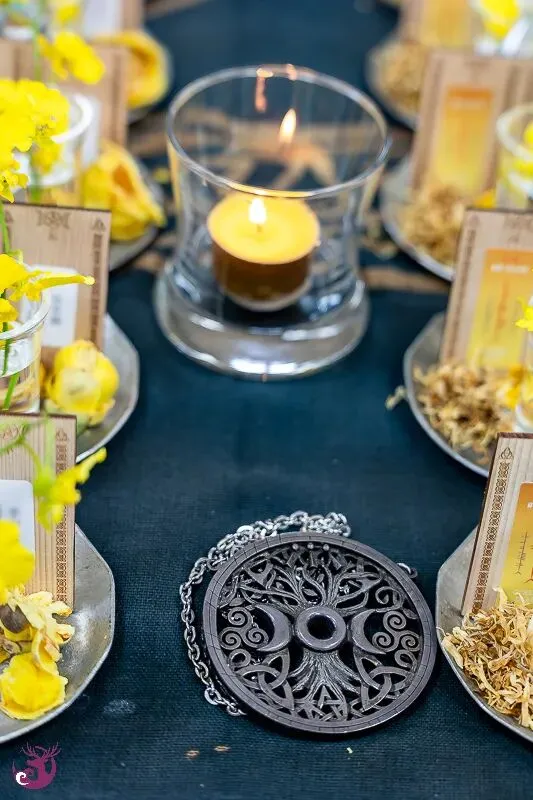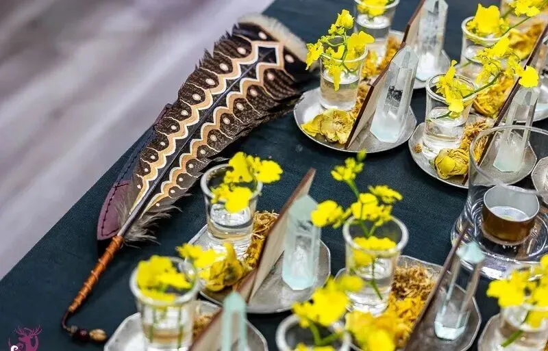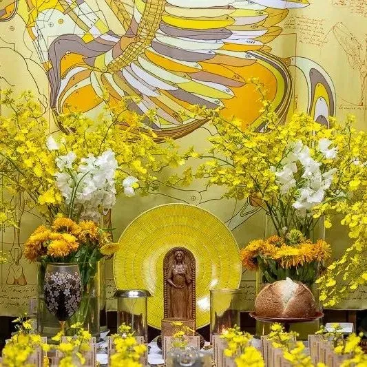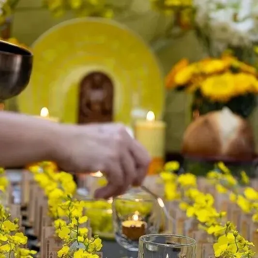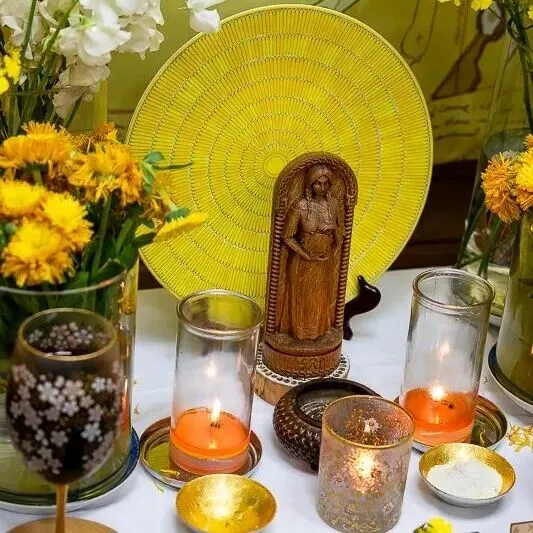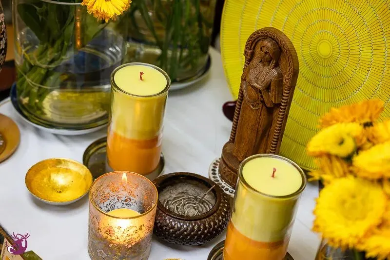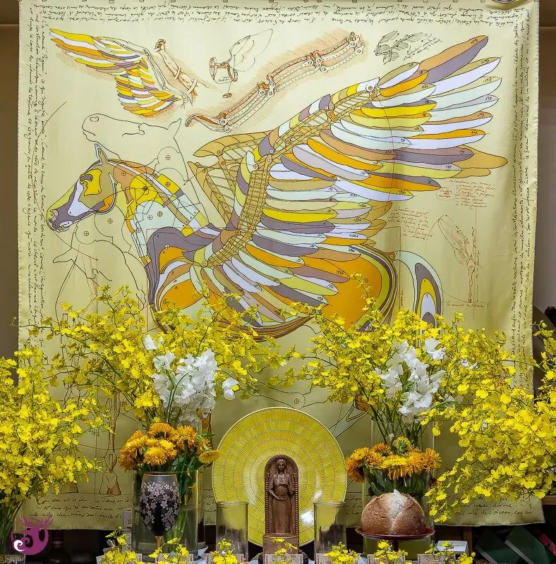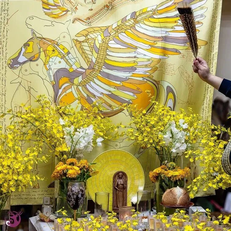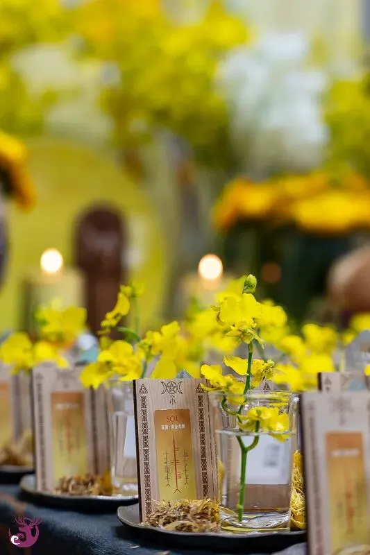 一开始,我对于仪式主题「黄金光照」的力量究竟为何,也是有些摸不着头绪。然而,在仪式开始前,一条极为合适的金黄色天马背景丝巾出现了;而女神选用的蜡烛颜色,以及布置在仪式盘中的柠檬文心兰,都呈现出一片金光灿烂的景象。仪式会场布置完成后,我们都忍不住惊呼,现场真是金光闪耀。