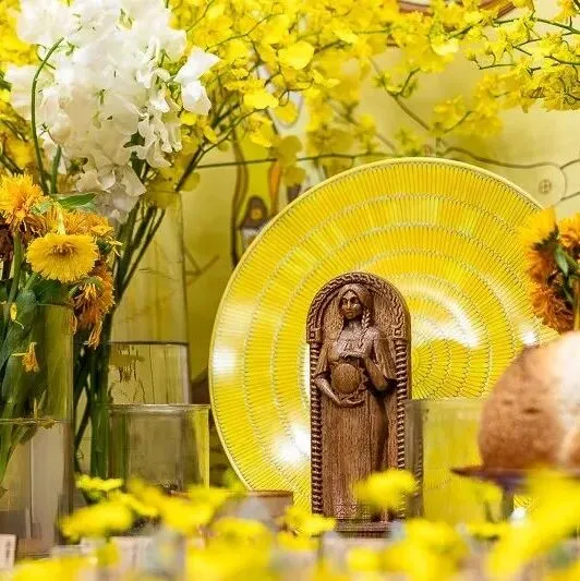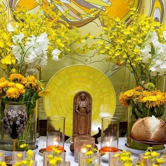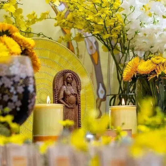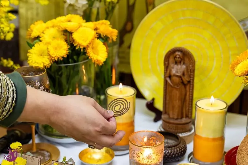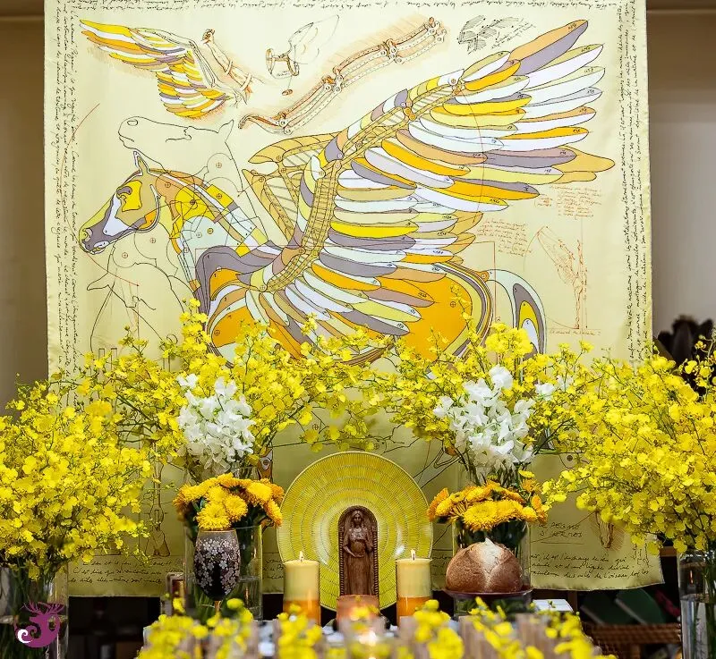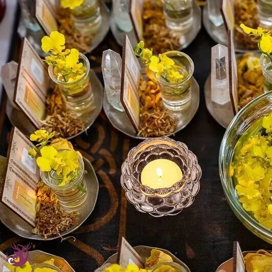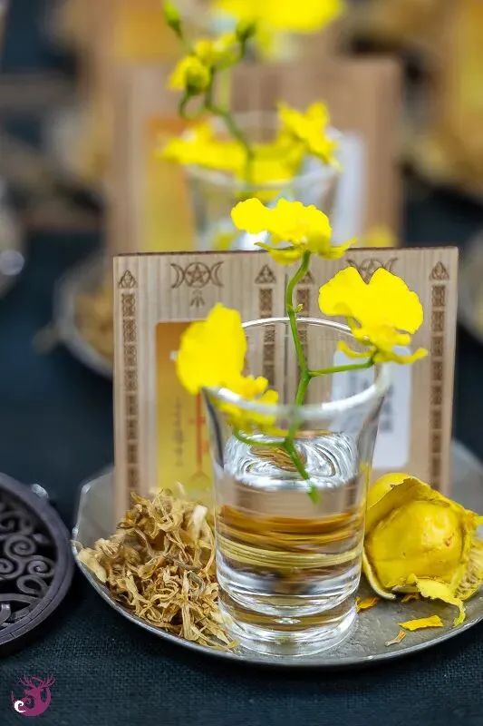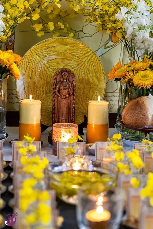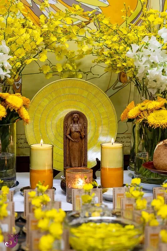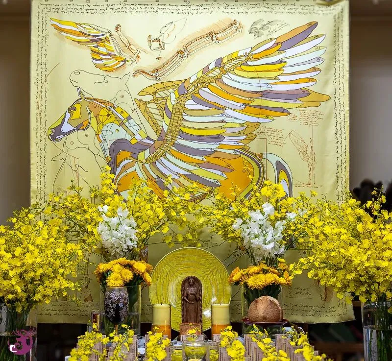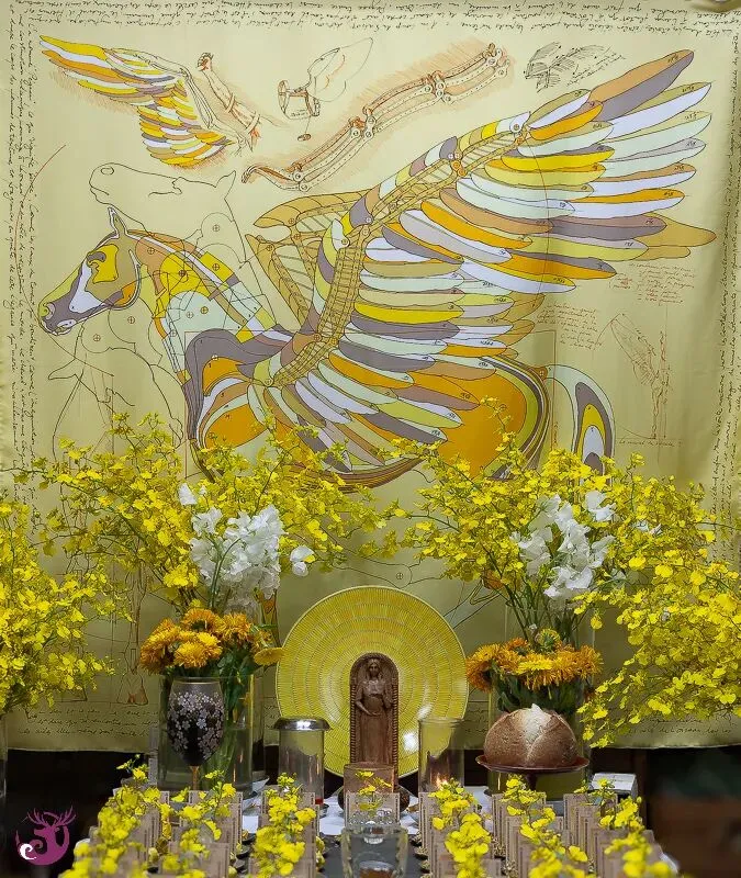 一开始,我对于仪式主题「黄金光照」的力量究竟为何,也是有些摸不着头绪。然而,在仪式开始前,一条极为合适的金黄色天马背景丝巾出现了;而女神选用的蜡烛颜色,以及布置在仪式盘中的柠檬文心兰,都呈现出一片金光灿烂的景象。仪式会场布置完成后,我们都忍不住惊呼,现场真是金光闪耀。