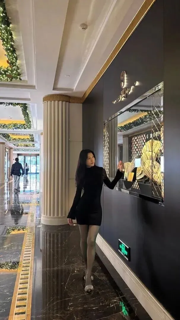 参加高.端聚.会,优.雅名媛.风不会错.。黑.色紧身短.裙配.黑色丝袜.,简.约高.级。站.在酒店栏杆.旁,.背景奢华,.整体.显得大.气。晚.宴或活动.穿这个,既.能秀身材.,又.保持优雅.