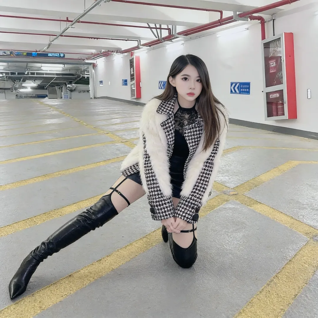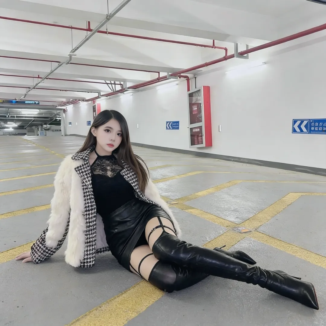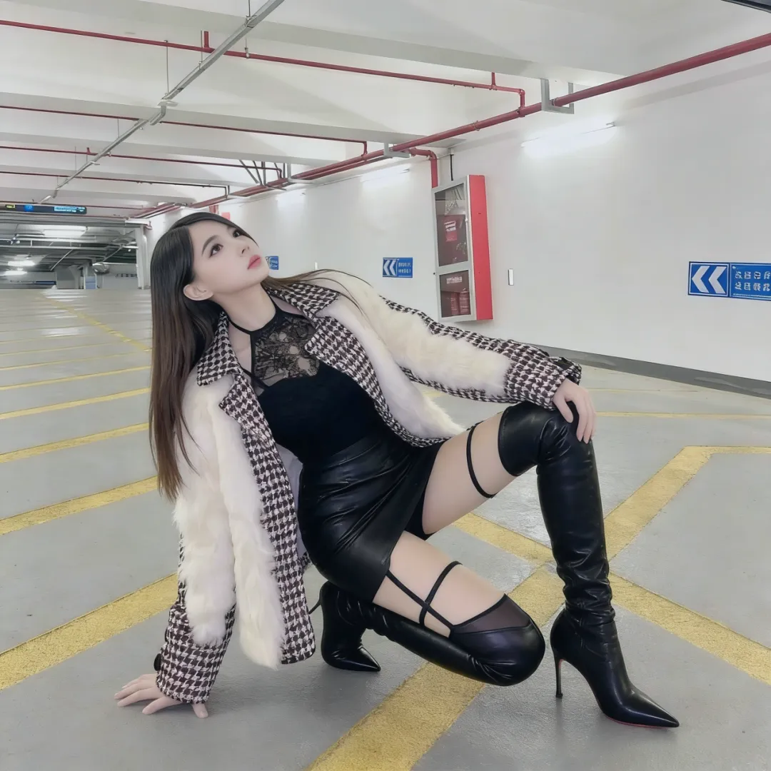当季最令人心动的玩法是「下半身失踪术」。选择及膝款漆皮长靴搭配超短皮质百褶裙,让靴筒与裙摆之间露出若隐若现的绝对领域。外罩一件oversize牛仔外套,半敞的衣襟下隐约可见蕾丝内衣的边缘——这种欲说还休的性感,比直接暴露更具杀伤力。