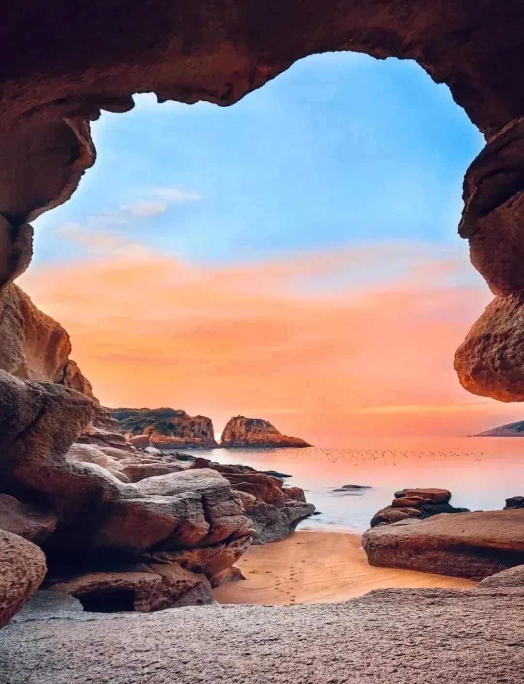 下尾半岛东西走向呈长条状直插大海。半岛周边分布着大大小小、形状各异的小岛礁,半岛中部南侧有一小海湾,千百万年的地质构造运动加上海水侵蚀、海浪拍击等外力作用,形成了许多洞穴、奇礁怪石环绕着到整个岸线,潮涨潮落变化无穷,春秋时节的清晨,站在洞穴内向外拍摄,前景沙滩与礁石融合,中景半岛环抱的海湾,远景一轮红日从山崖口冉冉升起。这里的海水清澈湛蓝,这里的礁石千姿百态,这里的沙滩晶莹剔透,是拍摄海礁日岀、风光人像、慢门海浪等各种拍摄手法的绝佳地上。