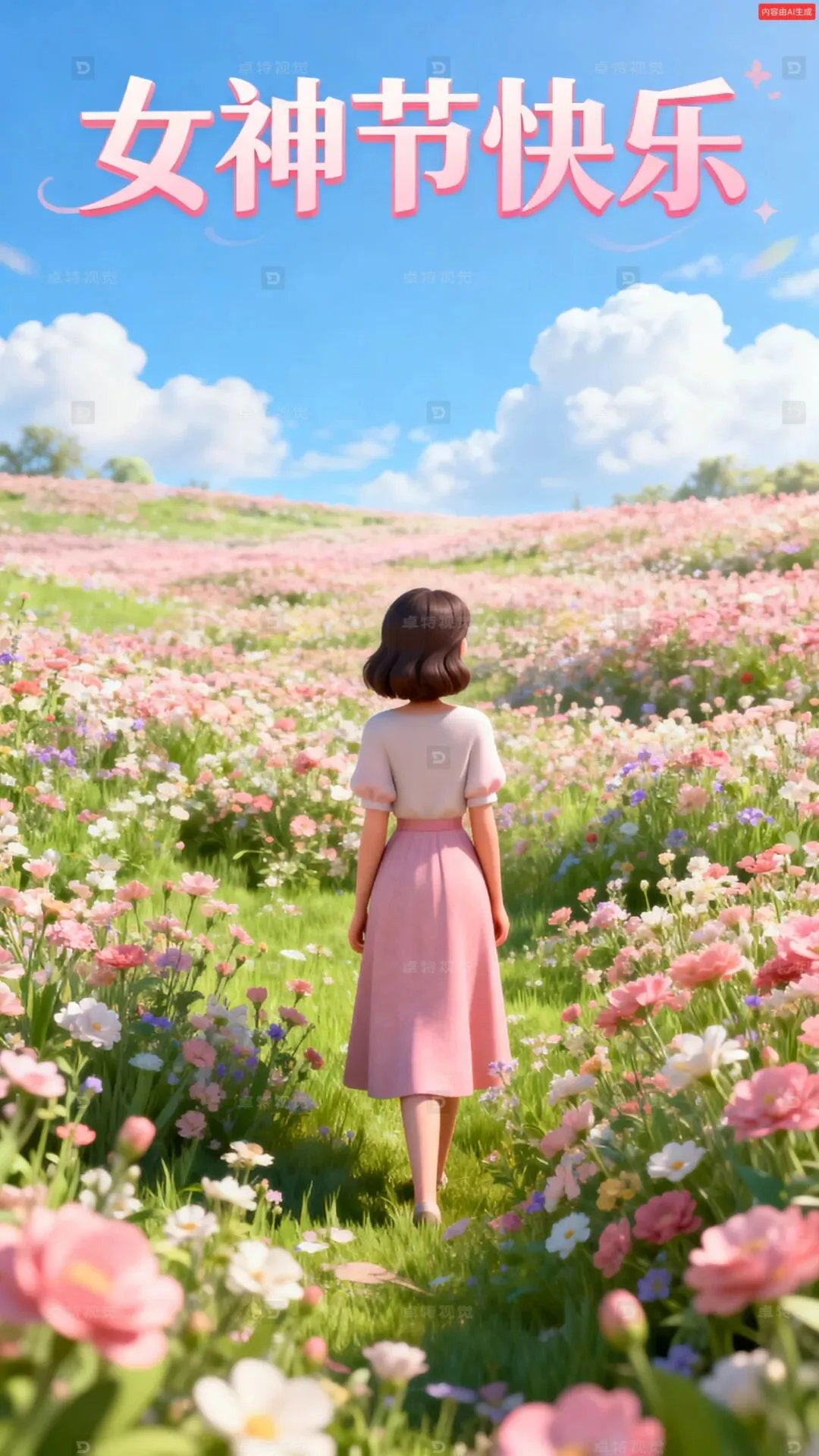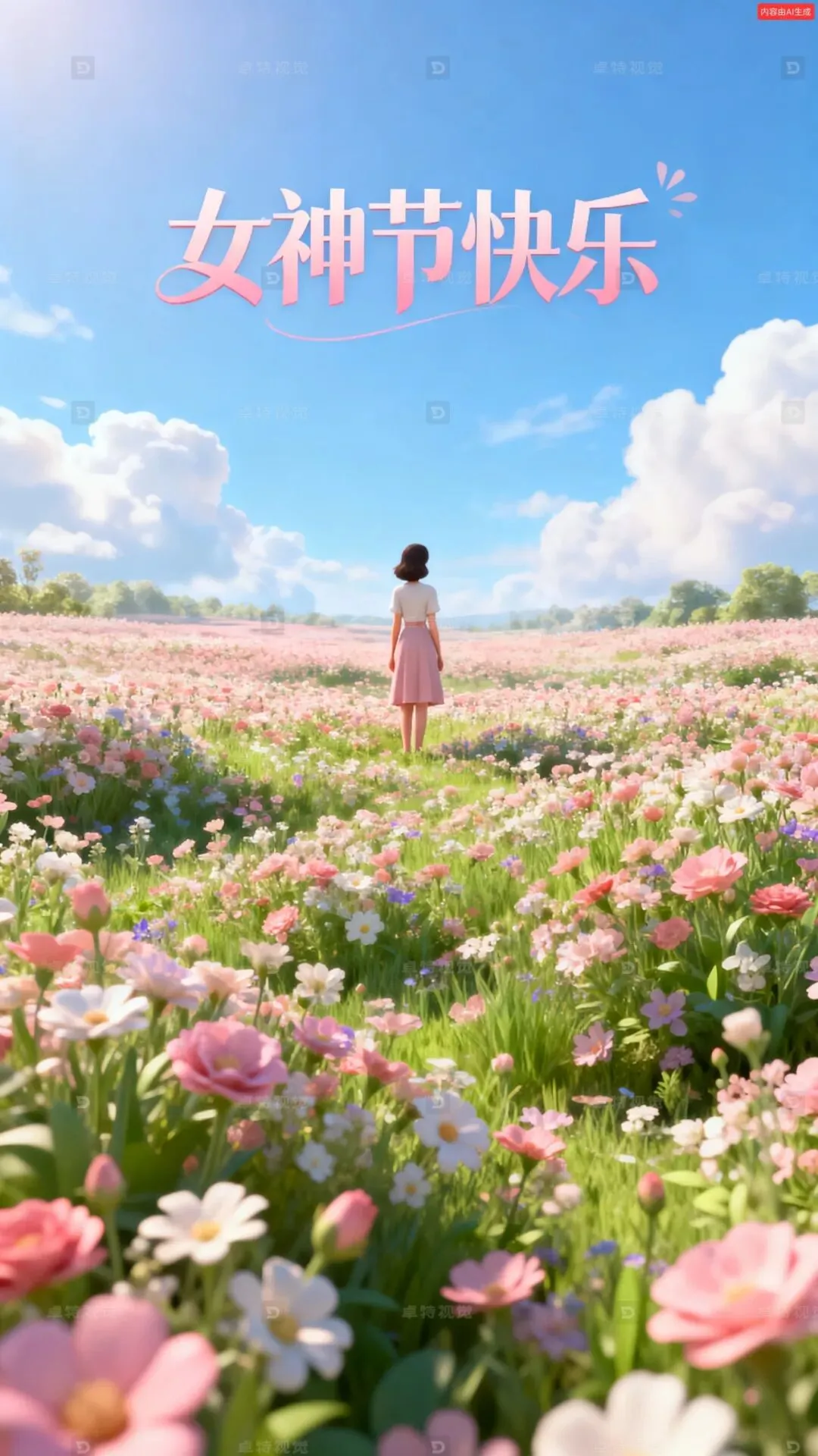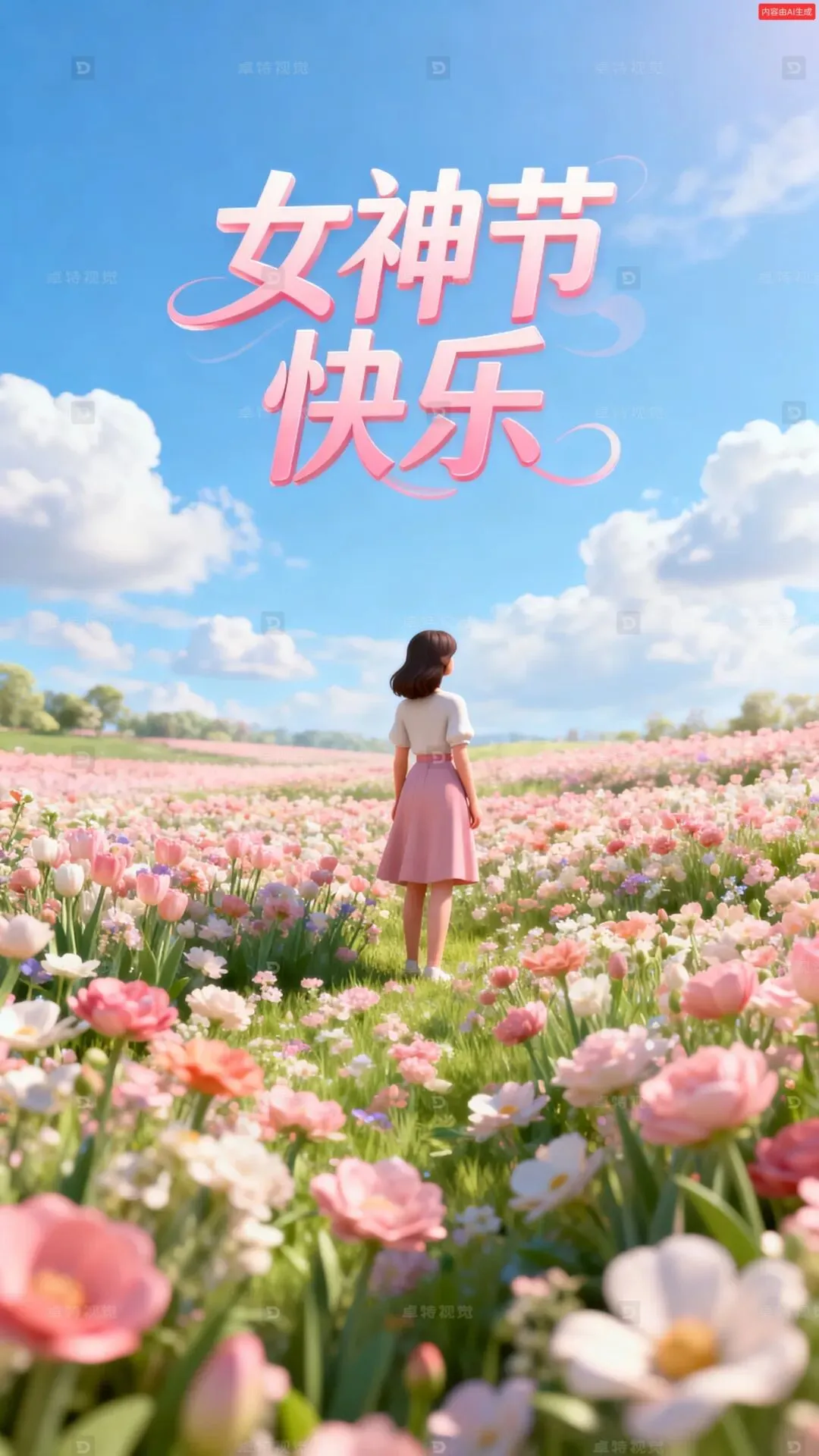 c4d作品,女神节大促kv海报。春天生机勃勃的氛围,蓝天白云,一大片花海,一个美女远远的站在画面中央,背对画面遥望远方,整体色彩搭配体现女性的柔和甜美。大景深,画面没有文字信息。octance渲染,柔和的光影,超高分辨率,商业海报。主标题“女神节快乐”字体和配色符合整体画面风格。