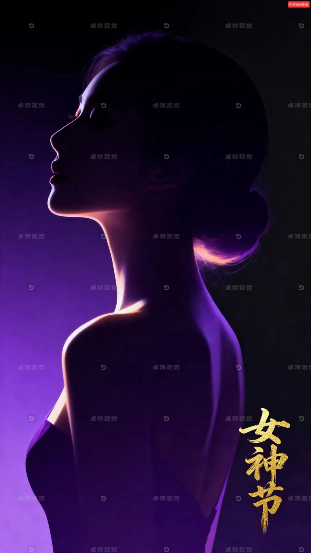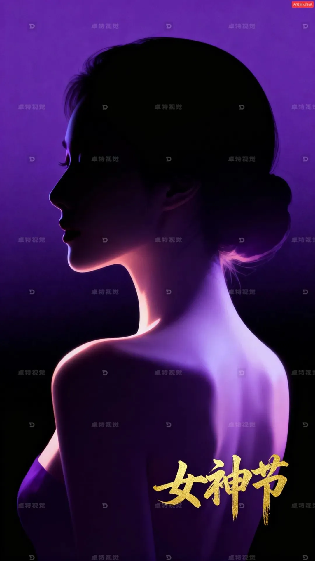 极致美女侧背影剪影,特写构图,采用极简主义风格,用优美的线条勾勒出女性的轮廓美,剪影边缘有柔和的光晕效果,色彩饱满,明暗对比强烈,富有意境。背景为渐变深色,从深紫到黑色的渐变,营造神秘优雅的氛围。右下角有狂草手写体的“女神节”署名,字体为金色,与整体色调形成对比。整体画面简洁而富有艺术感,光影效果突出剪影的美感。
