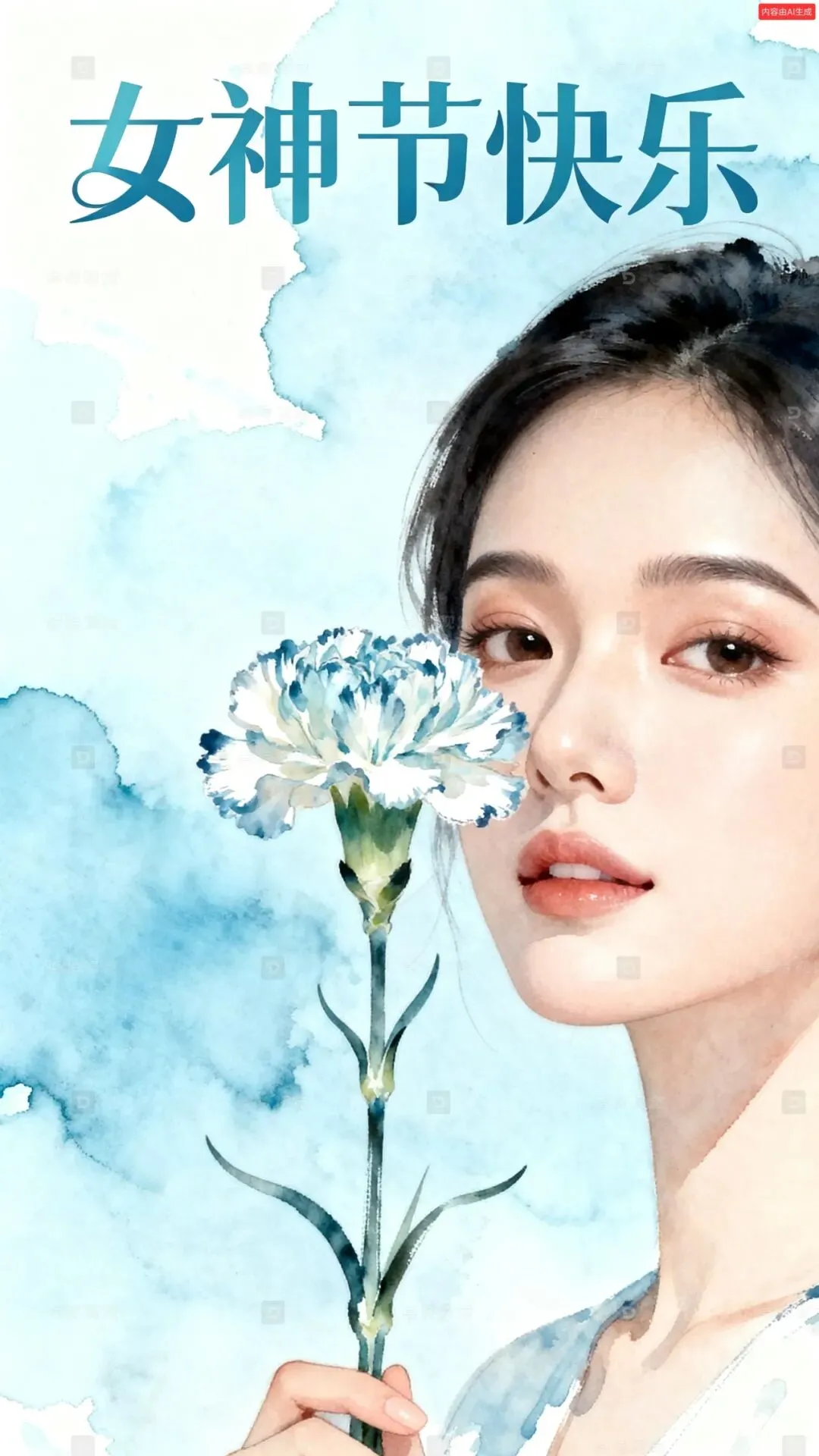 女性力量,绽放光彩,康乃馨花与女性手持花的形象,面部特写,背景是清新淡蓝色的水墨风格,花瓣细腻,女性面容清新自然,智性美感,简约而不失高级。花体变形主标题“女神节快乐”,颜色符合海报整体画风。