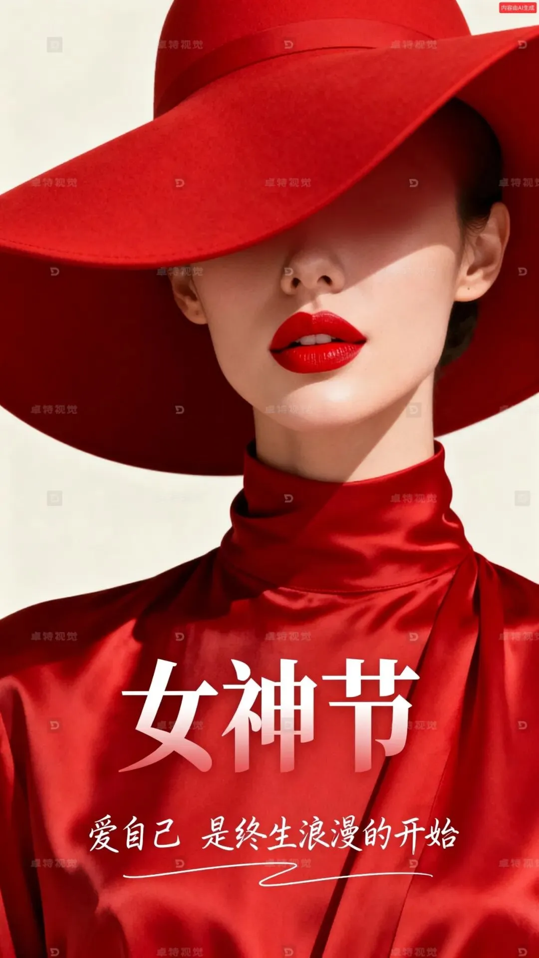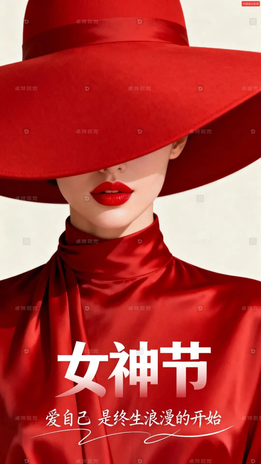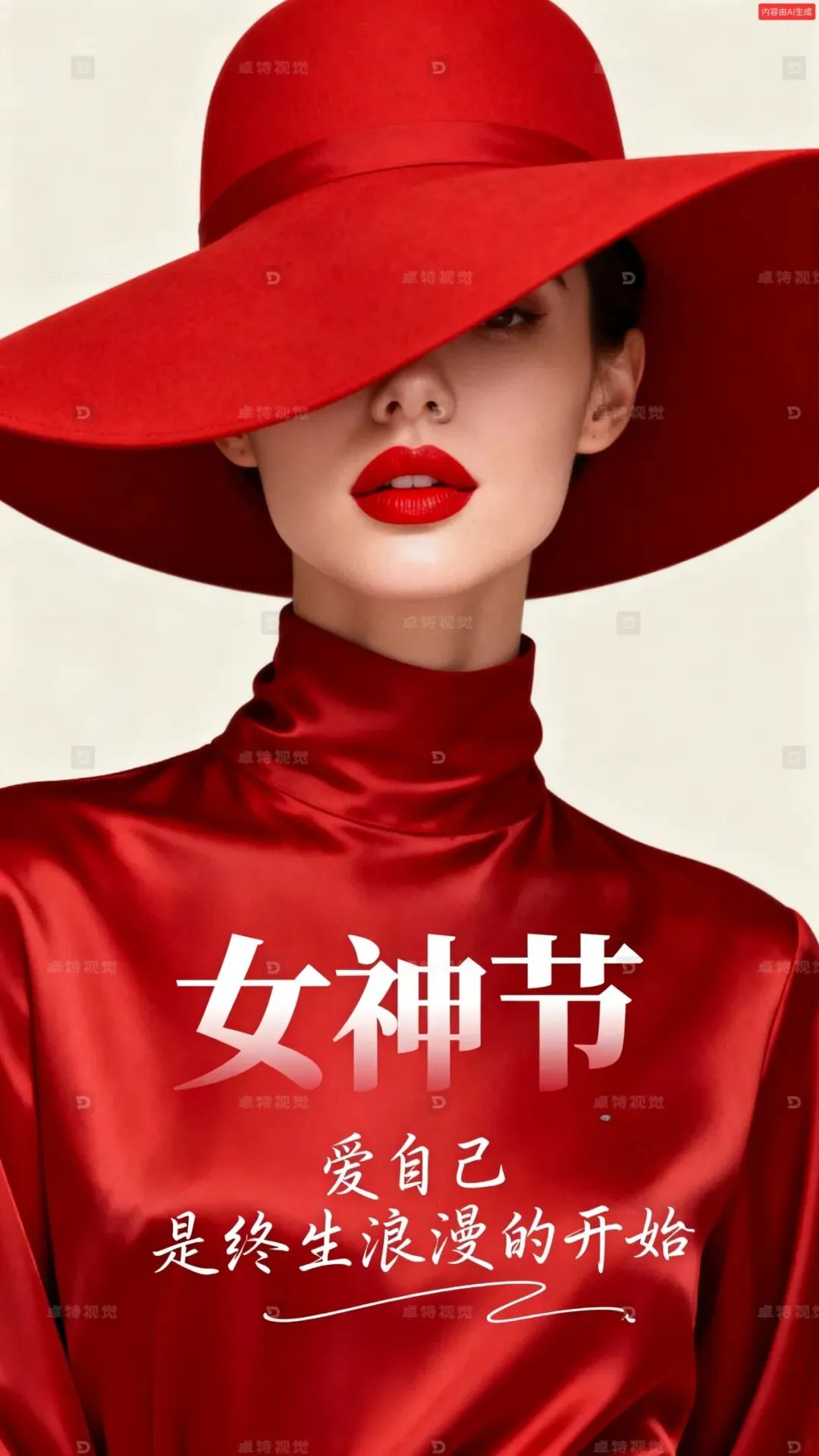 现代极简高级质感插画,以大面积正红色为背景,人物背景是米白色空白区域,画面主体是一位女性的半张脸,被一顶超大号正红色宽檐帽几乎完全遮挡,仅露出饱满鲜艳的红唇与线条柔和的下巴,她身着同色系高领红色丝质面料服装,面料垂坠感强,主标题超大白色渐变有层次感“女神节”,手写文字小号装饰字像是签字 ““爱自己 是终生浪漫的开始””:两行排版,文字连笔,灵动跳跃,钢笔字,细线条,错落有致,部分笔画延长。整体色调以正红与米白为主,氛围优雅、神秘且充满力量感。