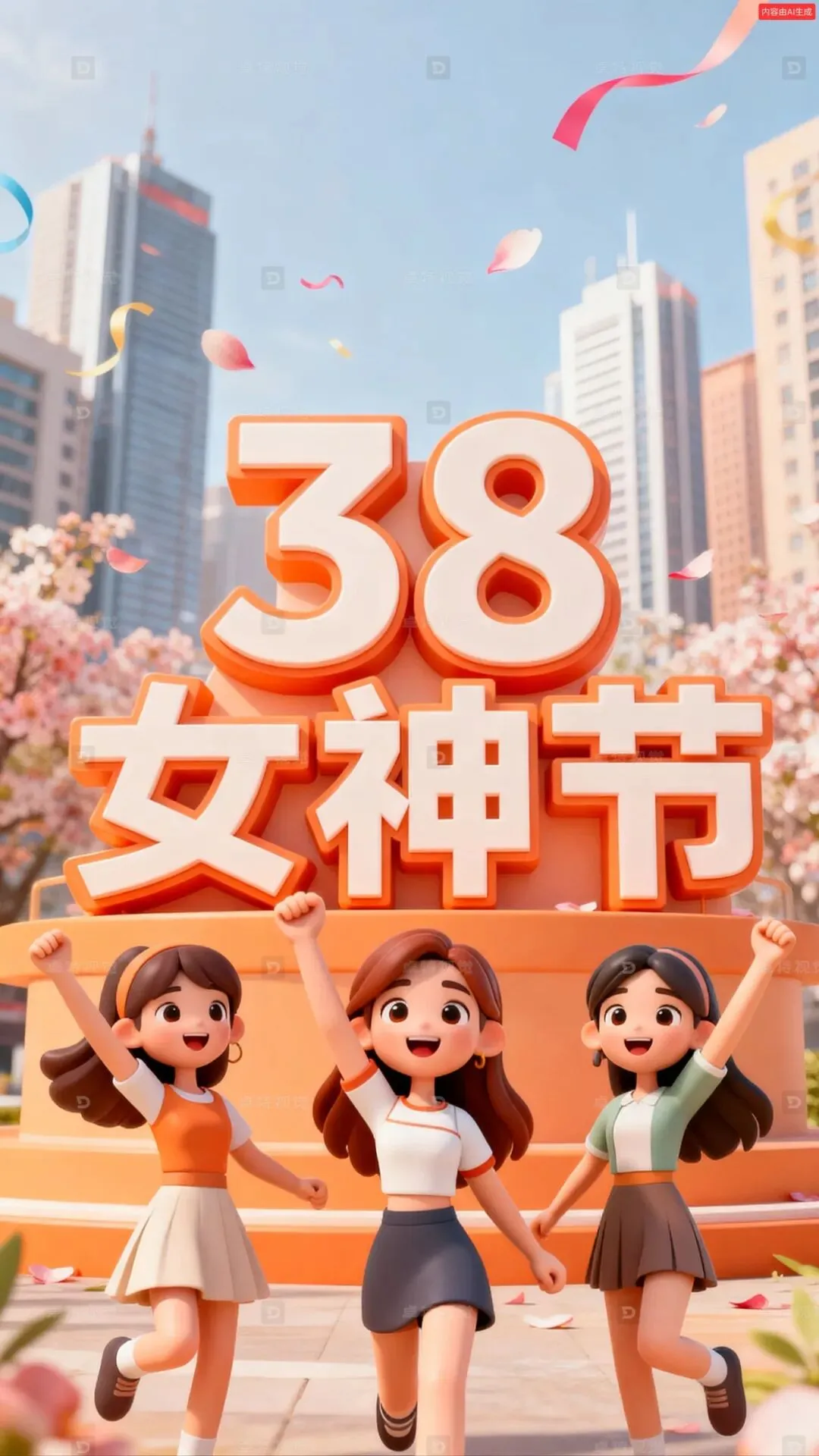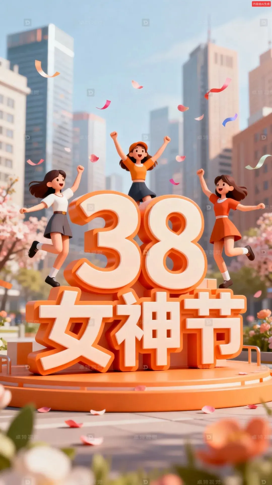 生成一张妇女节的海报,背景是虚化的城市,游戏风格,中间有一个立体字,文字“38 女神节”扁平插画,矢量图,字体前有三个年轻女孩在欢呼,3D渲染,背景是虚化的城市,春暖花开的城市背景,高楼大厦,现代城市,恬静唯美的画面,青春活力的氛围,空中飘着少量彩带和花瓣,庆祝节日,橙色,暖色调,高清细节。