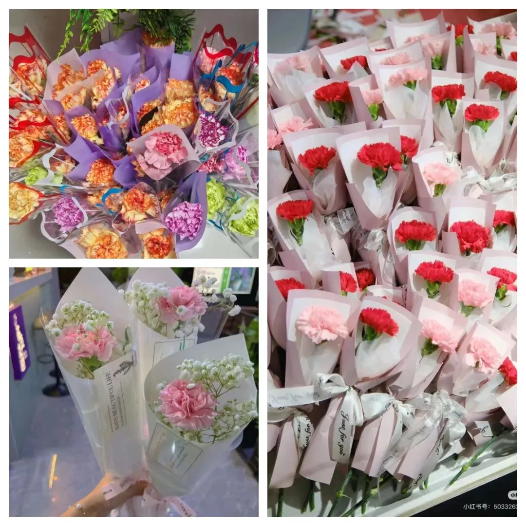 ▫️ 简约基础款:精选B级红色康乃馨,花头饱满、茎长挺拔,搭配简约丝带与牛皮纸/透明袋包装,干净雅致,低调中藏着温柔,性价比拉满,适合企业全员普惠;