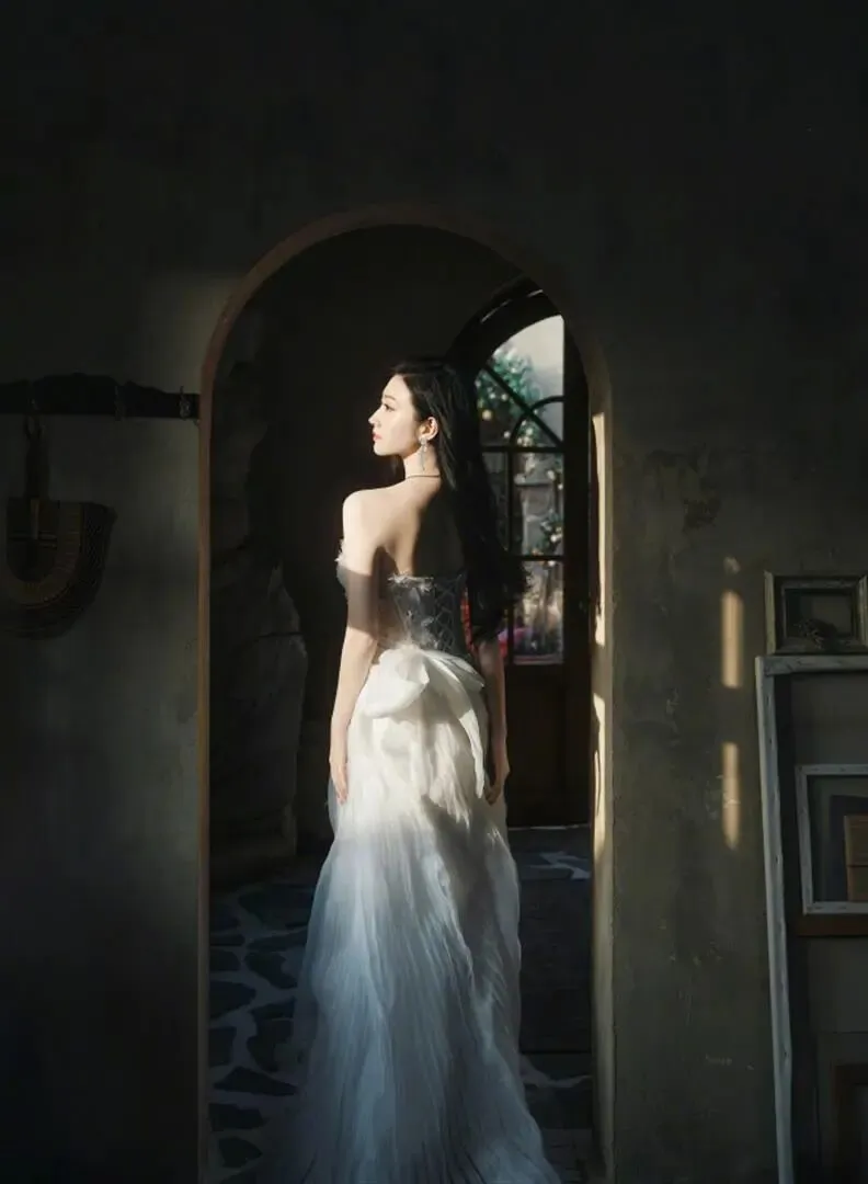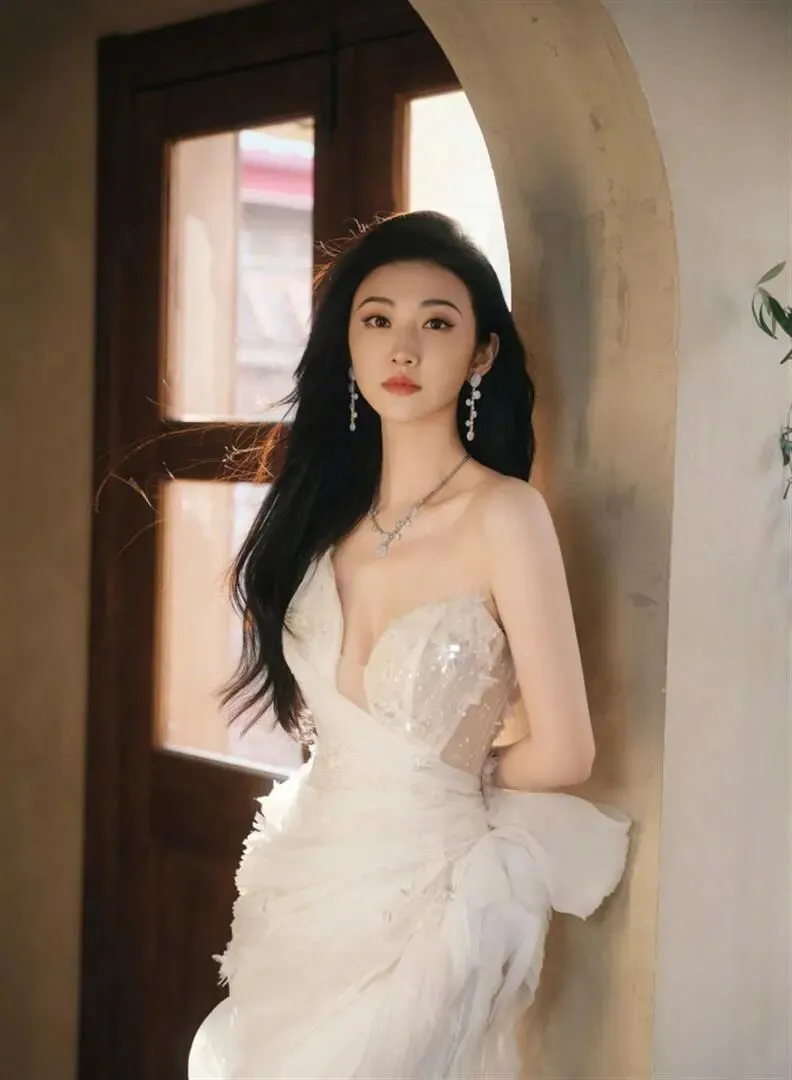 抹胸设计,兄弟们,这真是检验身材的“终极考题”!它要求锁骨要清晰,肩线要流畅,手臂线条还得紧致——少一分都不行。但你看景甜抬手捋头发那张,腋下和前胸的线条干干净净,没有一丝多余的褶皱或赘肉。