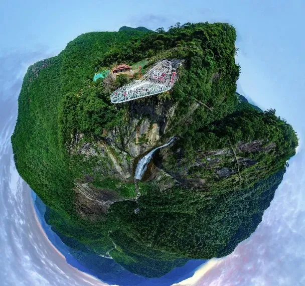 悬空高度314米,下面是深不见底的悬崖峭壁和奔腾而下的瀑布,是景区的网红打卡点和爱情圣地。