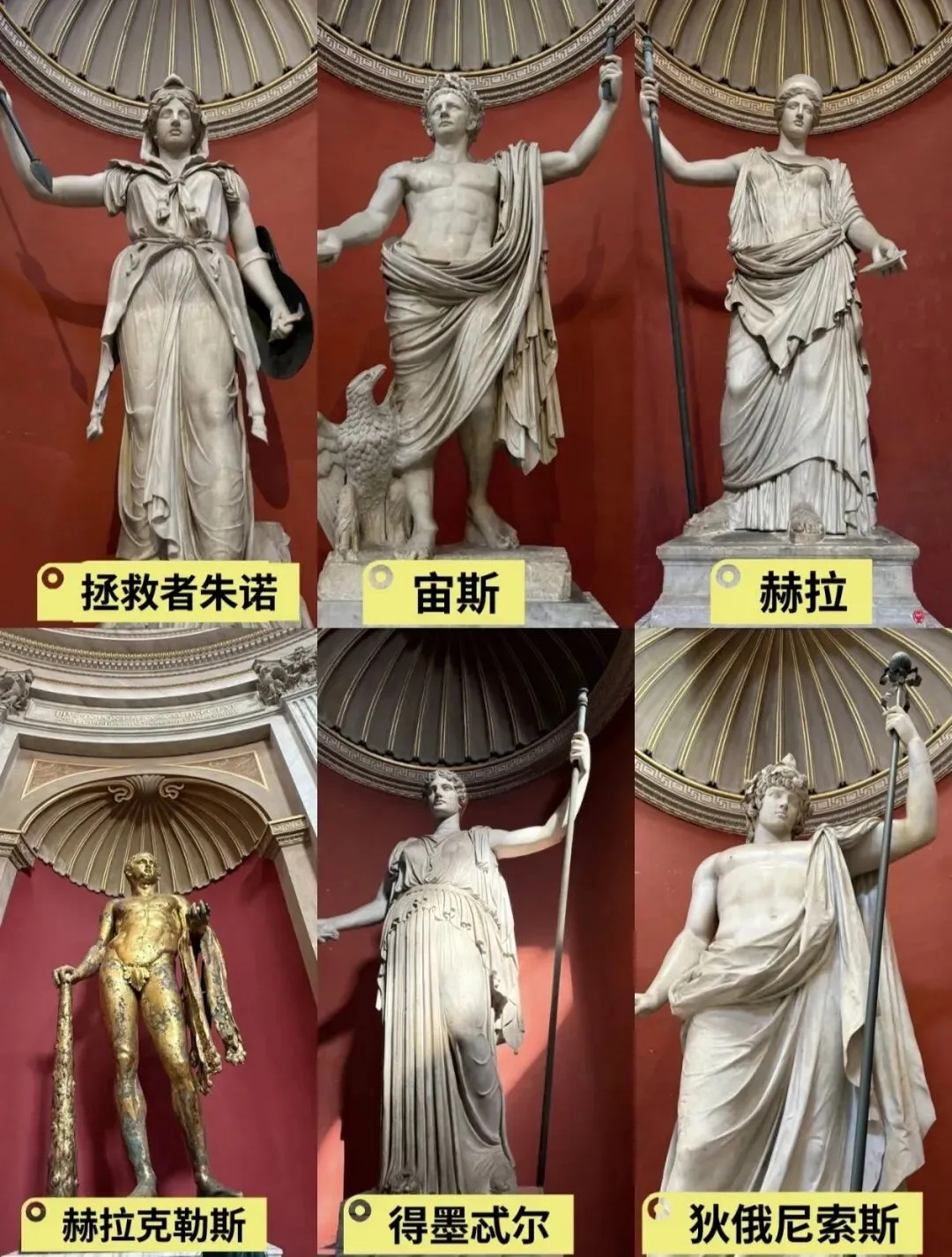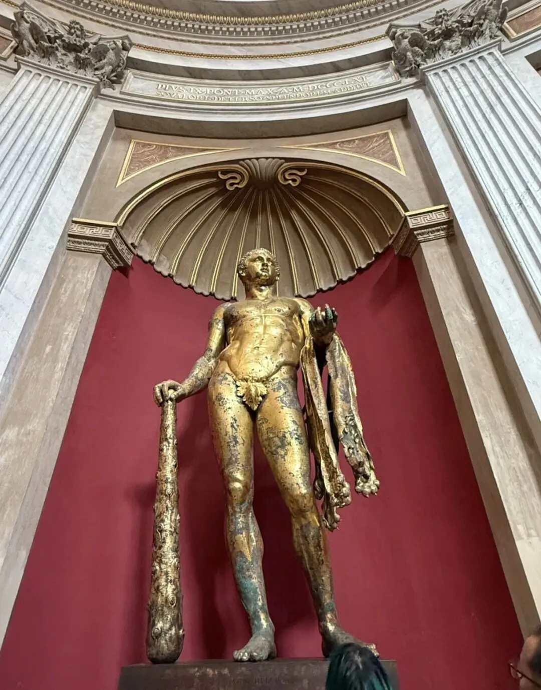 大厅四周建造了一圈神龛,里面伫立着著名神话或历史人物的雕像。与缪斯厅里环绕的都是女神相反,这里围绕着的都是高大威猛健硕俊美孔武有力的男神,如一手拿着狼牙棒,一手举着看不见的金苹果,胳臂上搭着狮子皮的大力神赫拉克利斯 。这个大力神雕像据说是公元一二世纪建造的,后来被雷劈倒,人们觉得他不灵了就把他埋葬了。直到十九世纪才又被重新发掘出来。教皇赏了一片无花果叶子给他当遮羞布,他才能如此神气活现地站在这里。