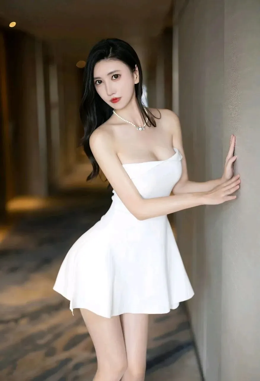 这组写真的场景设定在现代酒店的走廊与房间里,浅灰的墙面、几何线条的地毯,还有远处模糊的暖光,都成了衬托她的绝佳背景。章芃芃选择的这件白色抹胸短裙,是整个画面的灵魂所在。简洁的抹胸设计,完美勾勒出她纤细的肩颈线条与锁骨轮廓,没有多余的装饰,却自带一种高级的清冷感。裙摆是微微散开的A字版型,长度刚好落在大腿中部,随着她的动作轻轻摆动,既保留了少女的娇俏,又不失成熟女性的妩媚。腰间没有任何束缚,让身材曲线自然流露,每一处线条都流畅得恰到好处。