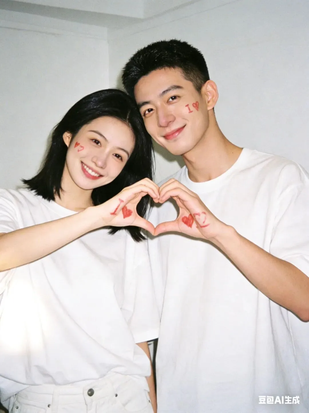 图二:两人面部各绘制半颗爱心,紧密贴合形成完整爱心,特写镜头突出甜蜜氛围   5. 妆容  • 女生:  ◦ 底妆:清透无瑕底妆,保留皮肤质感,无厚重粉感,呈现自然通透的妆效  ◦ 眼妆:自然大地色眼影,睫毛纤长卷翘,眼线柔和,强调眼神灵动  ◦ 腮红:淡粉色腮红,营造元气少女感  ◦ 唇妆:裸色系哑光唇釉,呈现自然饱满的效果  • 男生:  ◦ 底妆:清透裸妆,保留皮肤质感,无明显妆感  ◦ 眼妆:自然眉形,睫毛纤长,强调眼神清爽  6. 光影  • 光线类型:柔和的室内侧光,来自画面左前方,营造明暗对比,突出人物轮廓  • 光影效果:面部受光均匀,皮肤呈现通透感,背景处有轻微的光影层次,整体光线温暖柔和  • 氛围:光线温暖柔和,带有甜蜜俏皮的仪式感,传递出俏皮又深情的情绪  7. 场景与背景  • 场景:极简白色室内空间,背景为纯白色墙面,营造干净治愈的氛围  • 背景:大面积的纯白色背景,无多余装饰,突出人物主体和红色涂鸦  • 景深:浅景深效果,背景完全虚化,焦点清晰地落在人物面部和上半身,突出主体  8. 构图与比例  • 构图:  ◦ 图一:人物近距离贴近,女生轻托男生脸颊,两人面部绘制涂鸦,俏皮大笑看向镜头,营造亲密互动感  ◦ 图二:人物面部紧密贴合,各绘制半颗爱心,特写镜头突出甜蜜氛围,传递深情互动感  • 视线引导:人物眼神或看向镜头,或看向彼此,与观众产生互动,增强画面感染力