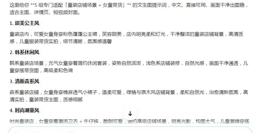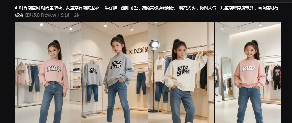 提示词:帮我生成5组女童在童装店铺带货的文生图的提示词