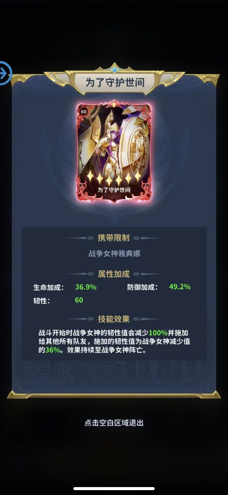 为全体队友提供8秒减伤(减伤40%),期间队友受奥义攻击可回复雅典娜20%最大生命值,溢出部分转化为5秒护盾,每名队友每轮仅触发1次。只可被强驱散。