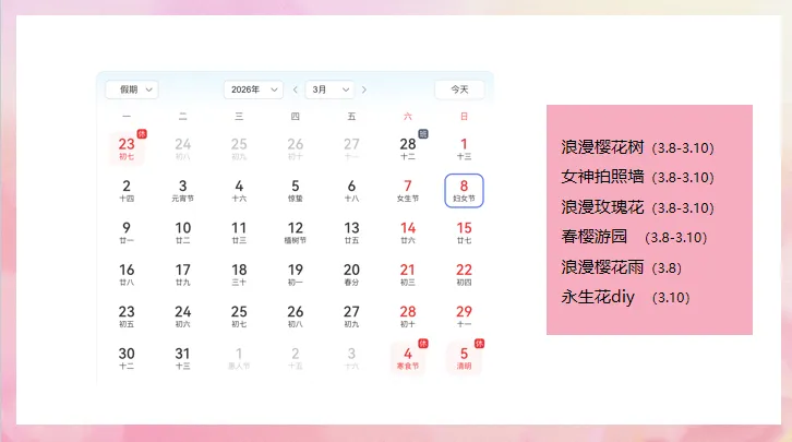 当前位置:首页>美女资讯>2026花漾女神 玩美时光春天樱游园浪漫樱花妇女节活动策划方案-27P(可下载完整版)