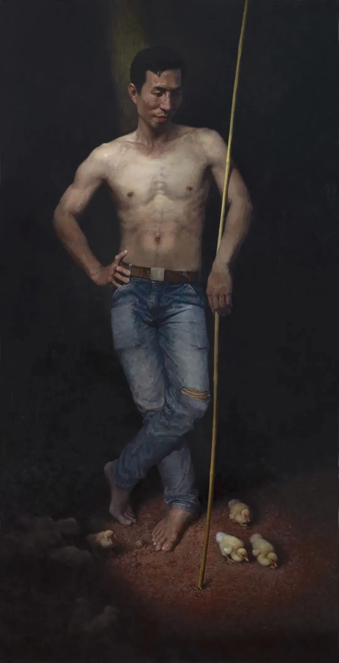 这批油画人物作品,有写生也有创作。以写真为基,以细腻笔触捕捉人物肌理——老人面颊的沟壑、市井者的鲜活神态,皆源于对现实的凝视,让形象有了呼吸感;创作则为魂,将具象观察升华为精神表达,如被困者、笼中猫等意象,暗合现代人的生存思考,让作品超越简单复刻。