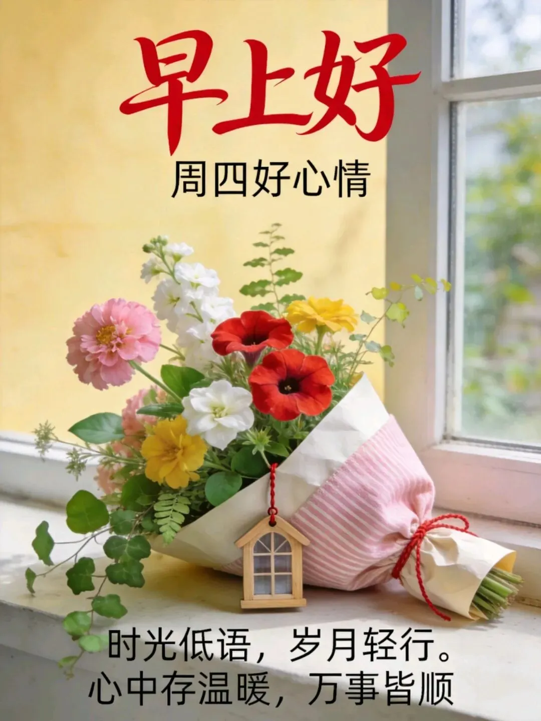 1. 周四早安,心藏一束光✨,步步皆明亮🌟。日子慢慢走🚶,心事轻轻放🌿。不慌不忙🌼,向阳而行🌻,把平凡过成欢喜💖,把寻常活成光亮💫。新的一天🌞,愿你眼里有笑😊,心中有暖❤️,脚下有路🛤️,一路顺遂。