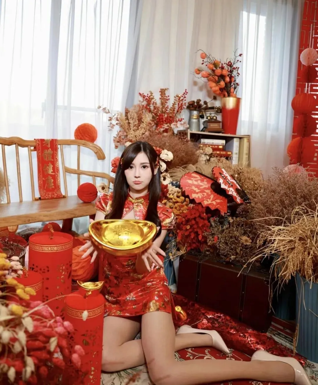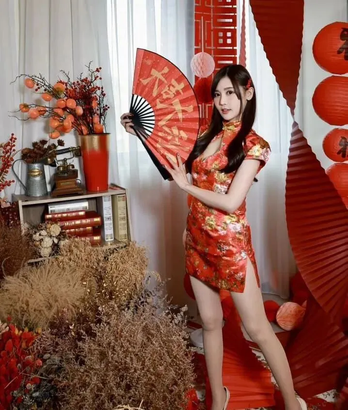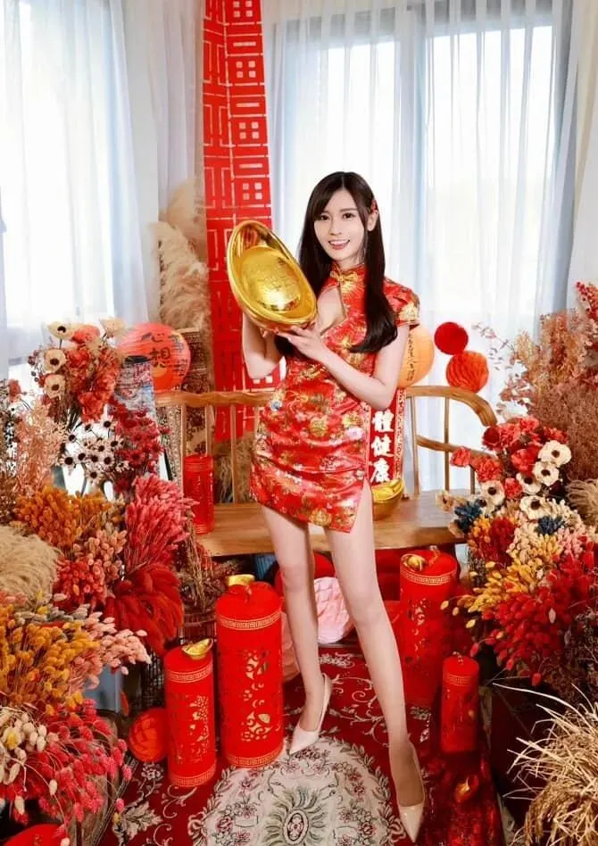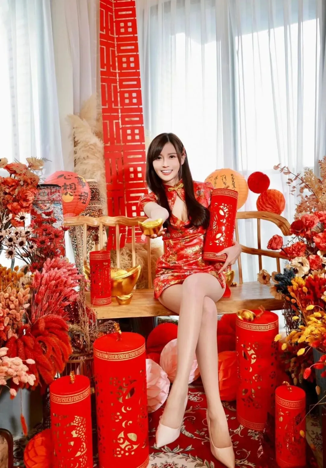 1. 红色旗袍耀新年‌:一袭鲜艳的红色旗袍,不仅映衬出佳人的白皙肌肤,更添浓浓的新年氛围。旗袍上的金色花纹,寓意着富贵与吉祥,让整体造型更加华丽出众。
