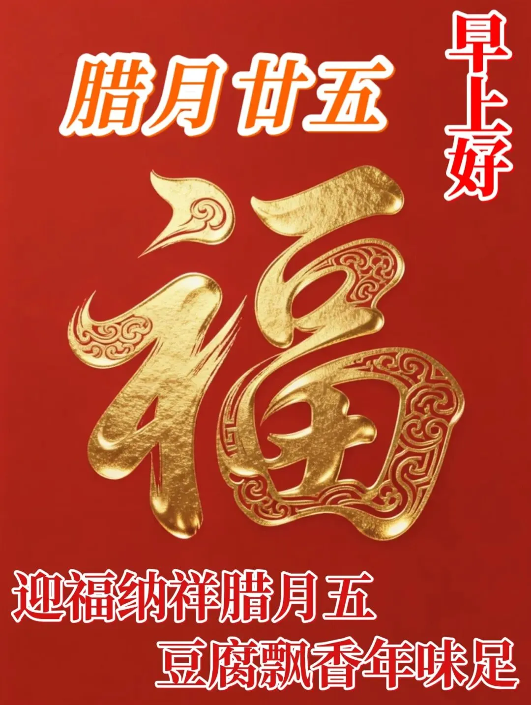 2、迎福纳祥腊月五,豆腐飘香年味足🥢!扫去庭前尘与土,除却心中忧与苦。金马踏春送祥瑞🐴,财源广进不胜数。愿你旧疾当愈,新岁长安,阖家幸福乐满屋🏮!