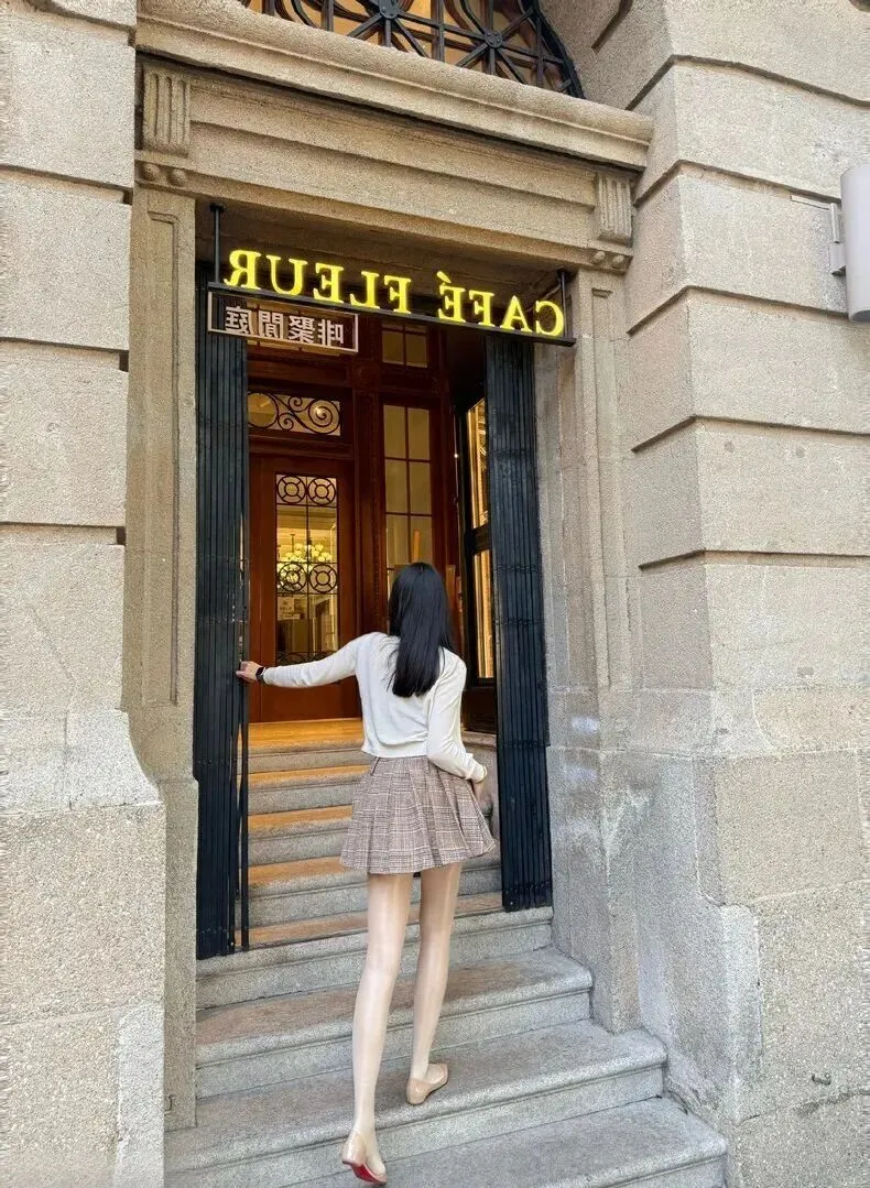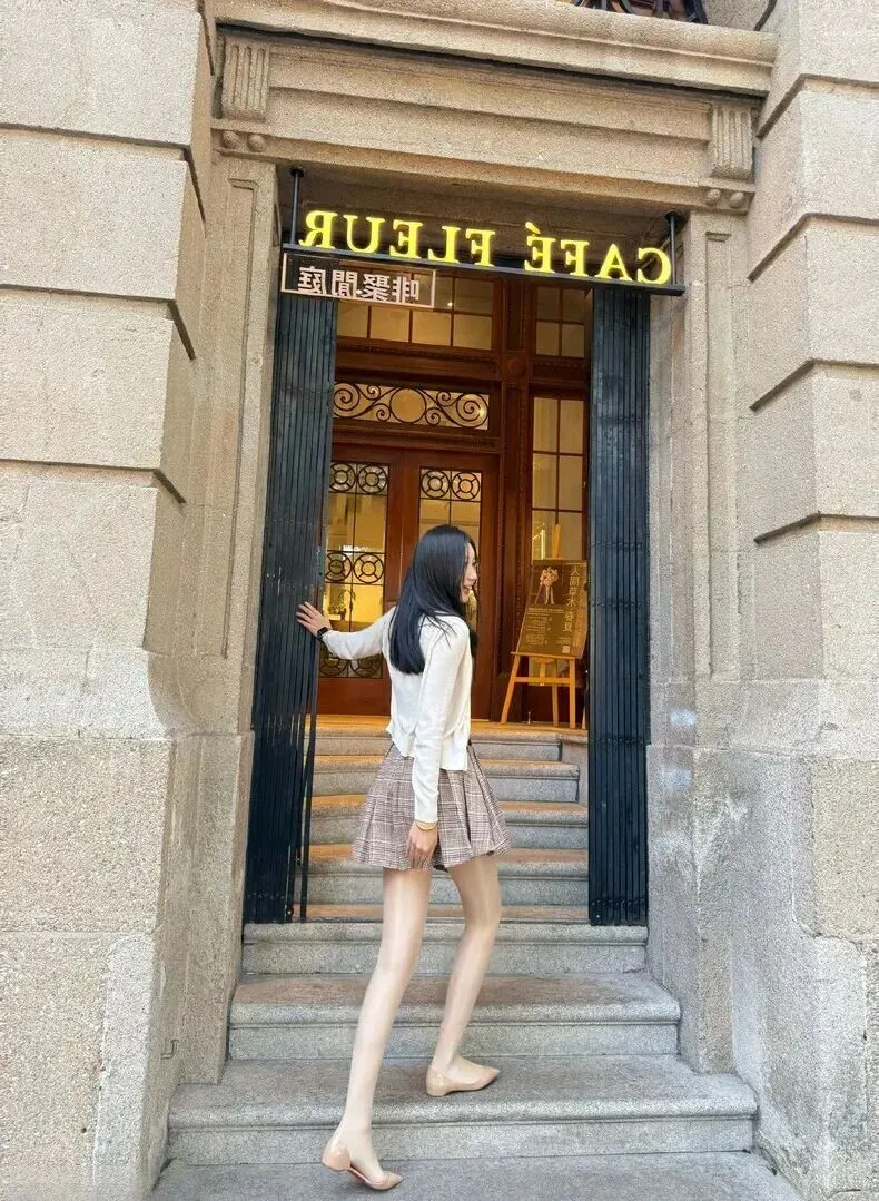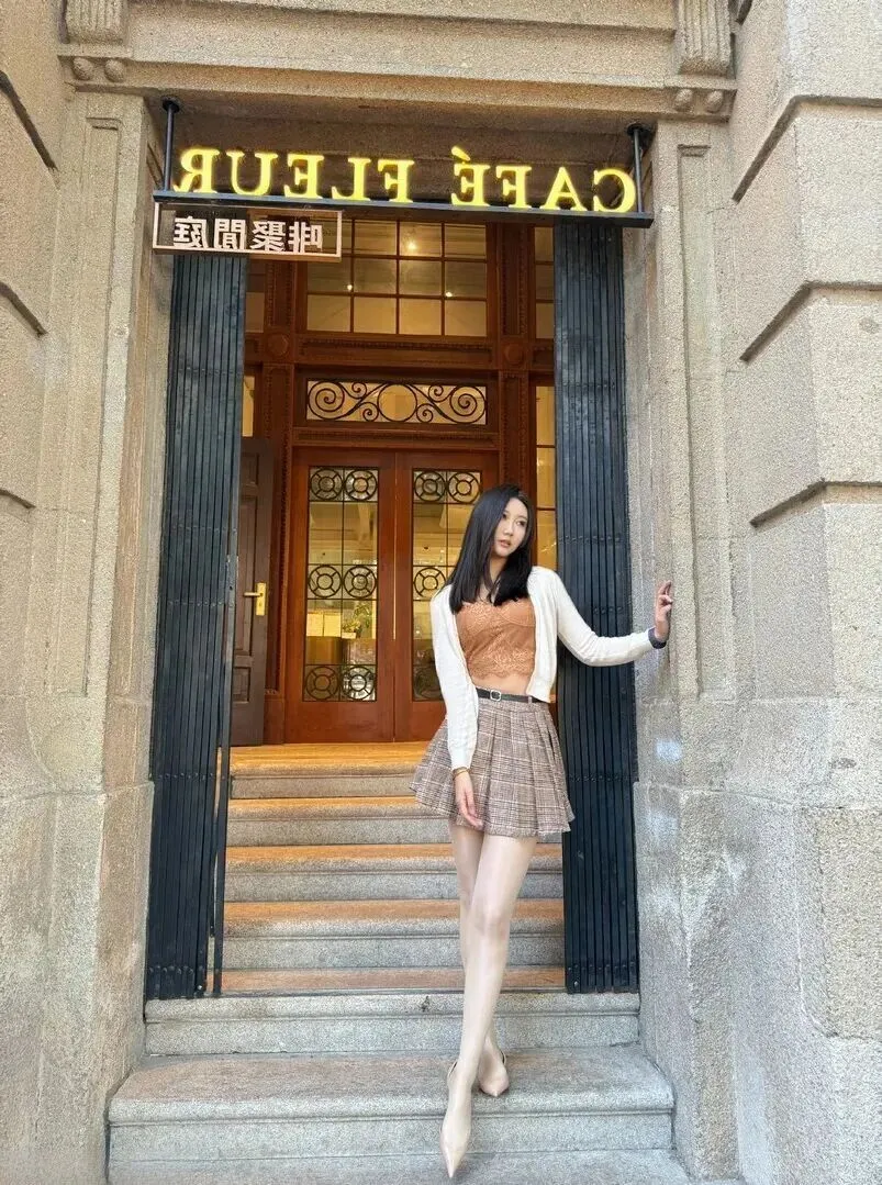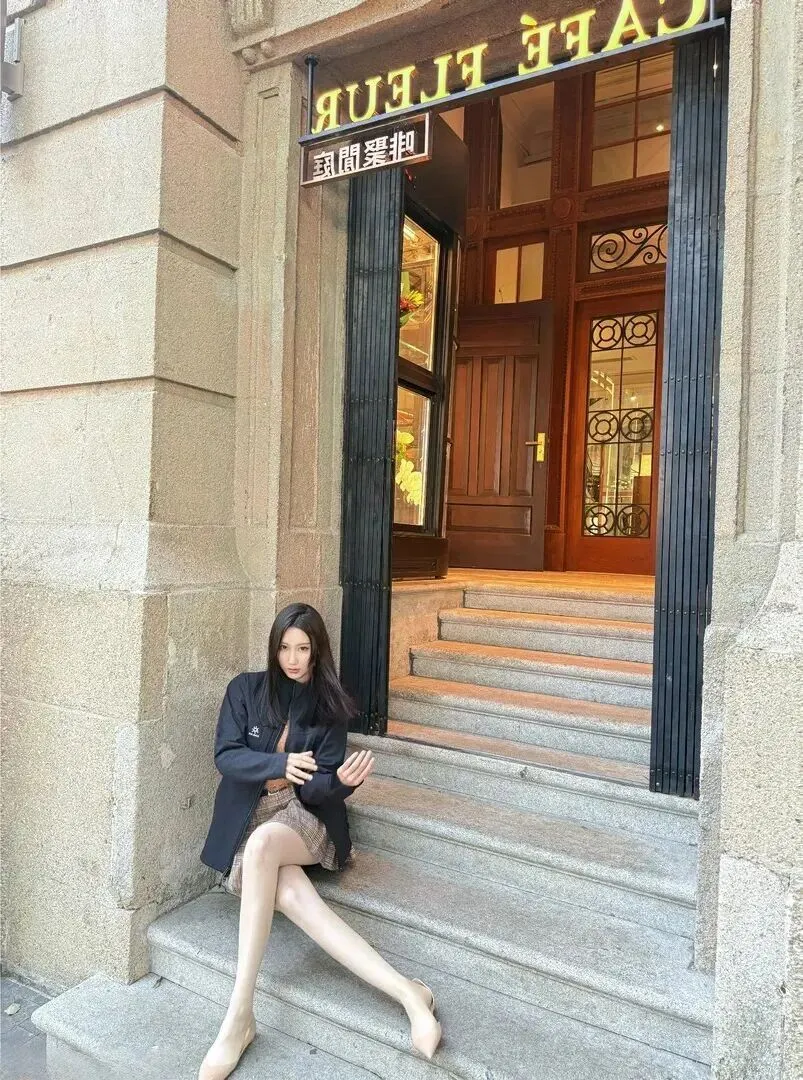 先来看这.套黑.棕配.色的。.她穿了一件.黑色外.套,.版型挺括,.看起来特.别有精神.。内搭是暖.棕色的.上衣,.颜色搭.配得恰.到好处,.让整体不会.太暗沉。.下身是一.条格纹短.裙,复古感.立马就.上来了.。配上肉色.的丝袜.和浅.米色的.低跟鞋,整.个人显得.又优雅.又有点小性.感。她.坐在那种.欧式建筑.的台阶.上,后面的.咖啡馆招牌.和灯.光,氛围.感直接拉.满。这种.穿搭平时.上班或者约.会都.能穿.,绝对不.会出错。