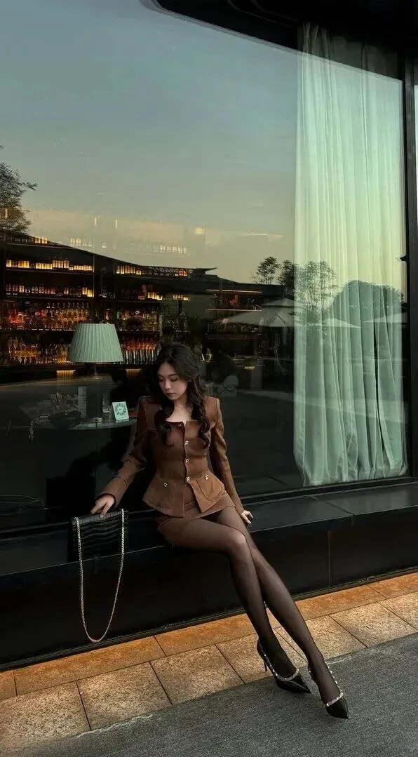 .晚上去餐.厅吃饭,她.把丝巾解.下来系在包.带上,西装.扣子打开.,露出V.领,瞬间从.知性变成.优雅挂。.暖黄灯.光下棕.色会更显质.感,黑.丝袜.和高.跟鞋配.在一起.,连.背影都.好看。
