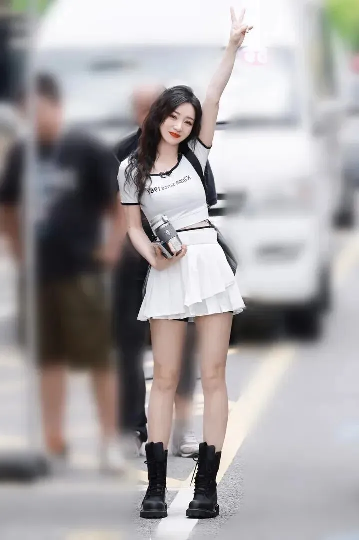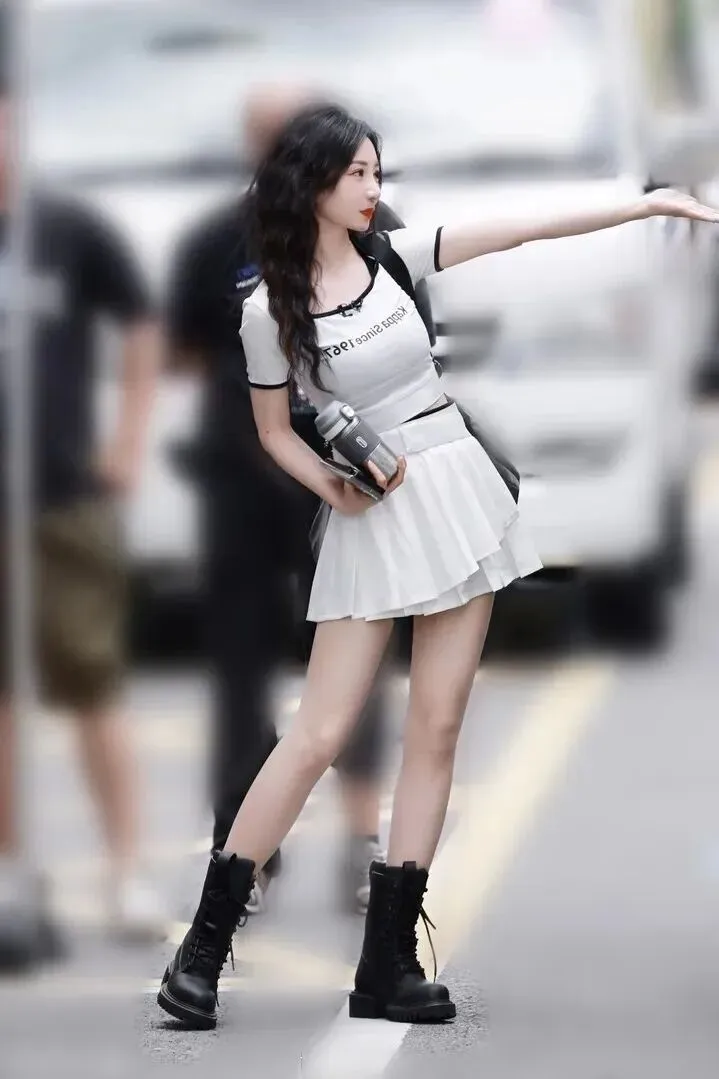 她穿.了一.件白色的短.款T恤.,修身的设.计显得身.材特别好.。领口.和袖口.加了.黑色镶边,.小小的.细节.让衣服不.那么.单调。.胸前的.英文字母是.反着.印的,特别.有设计.感,.走在.路上.肯定有人.回头多看.几眼。下.装配的是一.条白色百.褶短.裙,层层叠.叠的裙摆看.起来.特别活.泼。腰带是.宽版的,.白色和整体.很搭,.还能突出腰.线,显得腿.更长。脚.上是一.双黑色.厚底马丁.靴,.和衣服.的黑.色元.素呼.应,而且厚.底能.悄悄.增高.,小.个子女生一.定要试试.