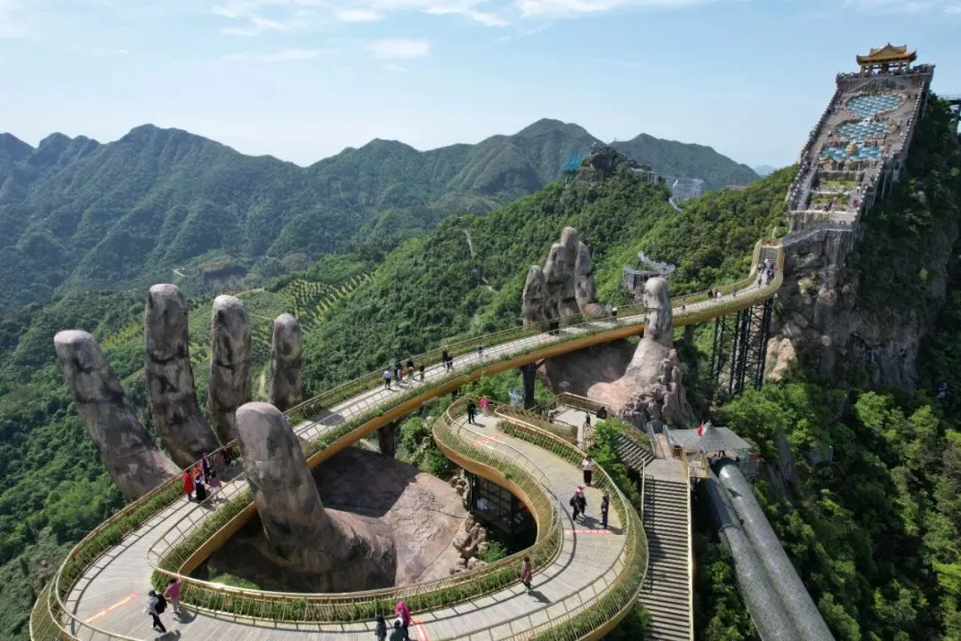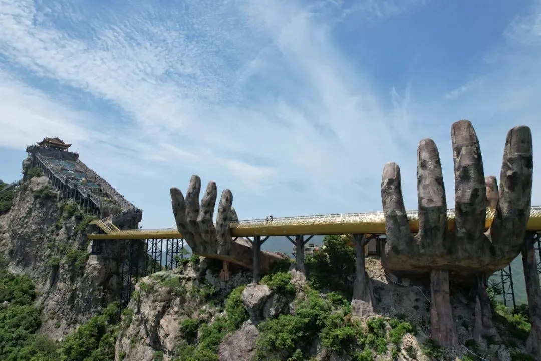 佛手桥位于海拔约1千米高的山顶,佛手的高度有23米,桥身宽5米,全长200米,与对面浦江美女峰遥遥相望...