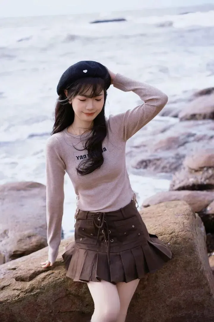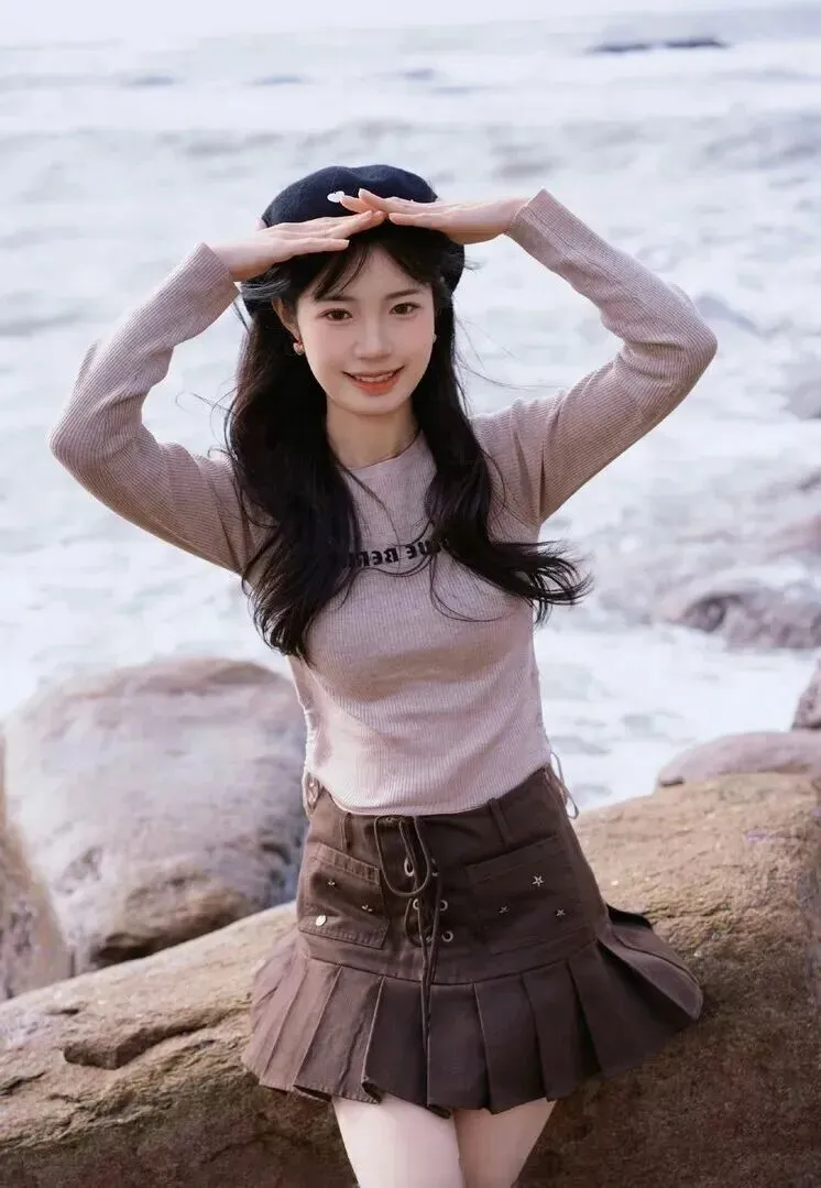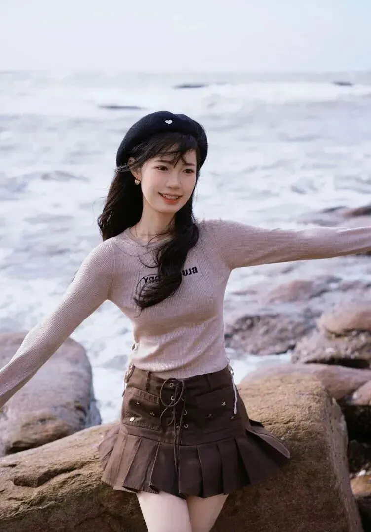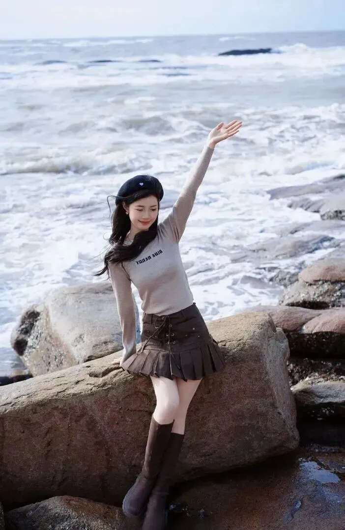 .套穿搭.走的是复古.学院风,听.起来有.点文艺.,其实特别.简单。浅.卡其色的针.织衫.,配.上深棕.色的.百褶短.裙,再加一.顶黑色.贝雷帽,整.体感觉温.柔中带点小.调皮。海边.风大,这样.穿既保暖又.上镜。