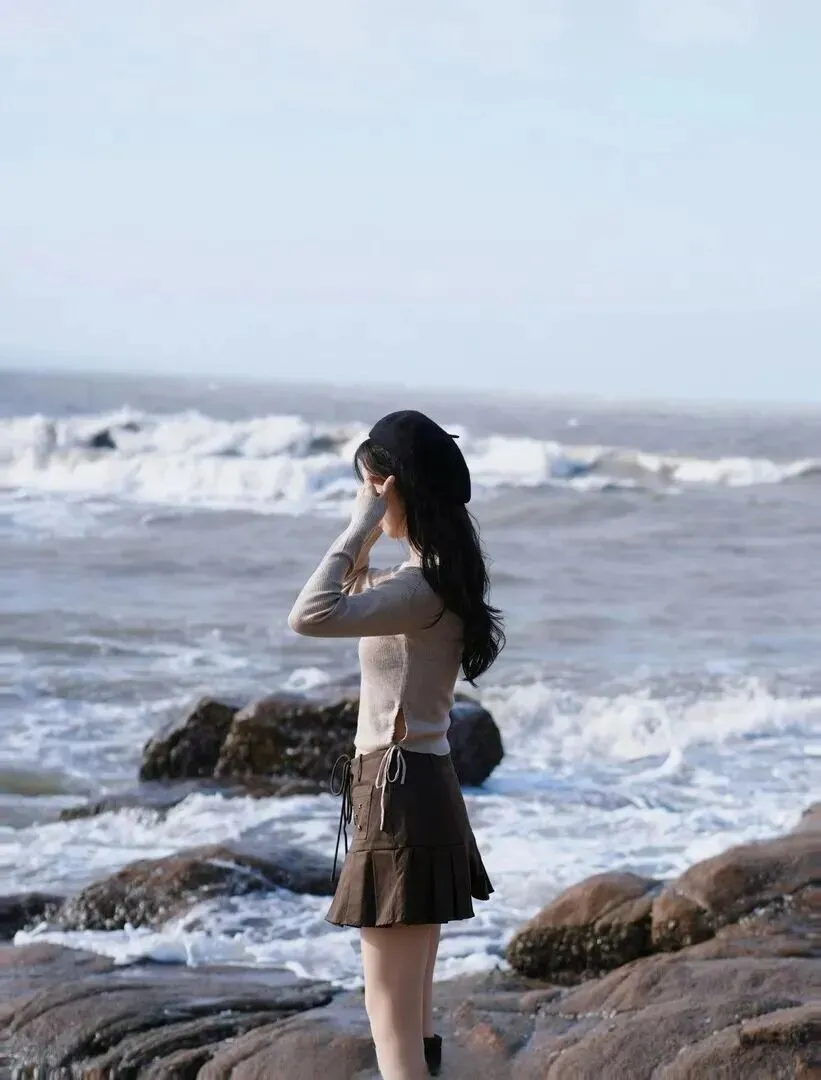 温柔.甜美.风是.我最喜欢.的。微微仰.头,闭.上眼睛.,嘴角上扬.,露.出一.个淡淡.的微笑。.左手轻轻.搭在贝雷帽.上,右手.撑在旁.边的礁石.上,双腿自.然弯曲。.整个人看起.来特别放.松,.好像在.海风中享.受时.光。