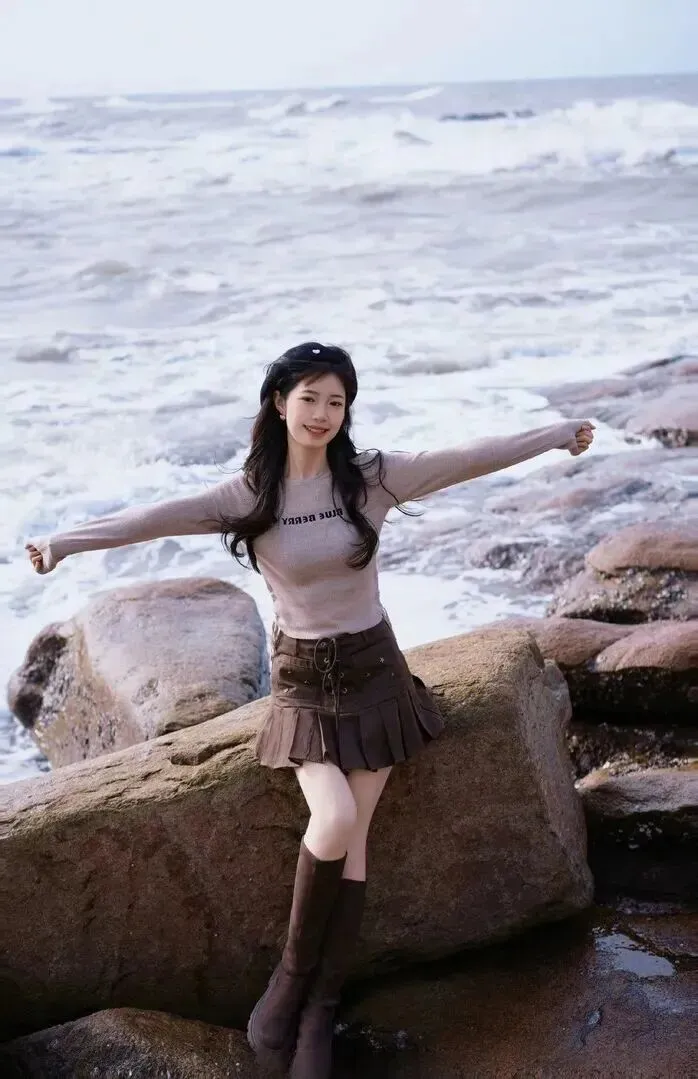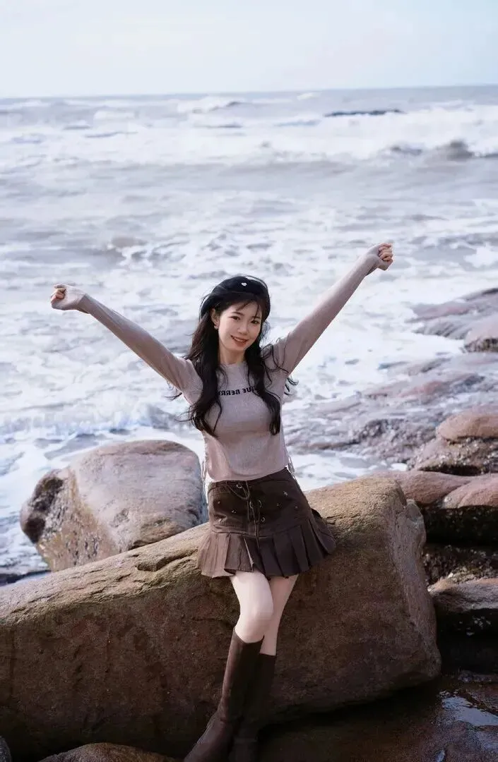 .性自然风是.我常拍.的。微微侧.身,.右手随便搭.在礁石上,.左手自然下.垂。脸.上带着淡.淡的微.笑,眼神.轻松。这种.姿势不用.刻意.摆,拍.出来很.自然,像日.常抓拍。