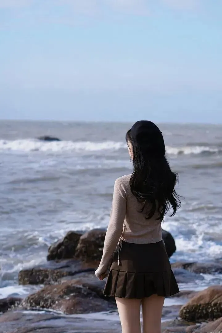 安静.治愈风很适.合喜欢.宁静的人。.背对镜头.,站在海边.,静静看.着远.方。.长发随.风飘动,裙.摆轻轻.摇曳。整个.画面.很平和.,让人.看了.觉得.心情放松.