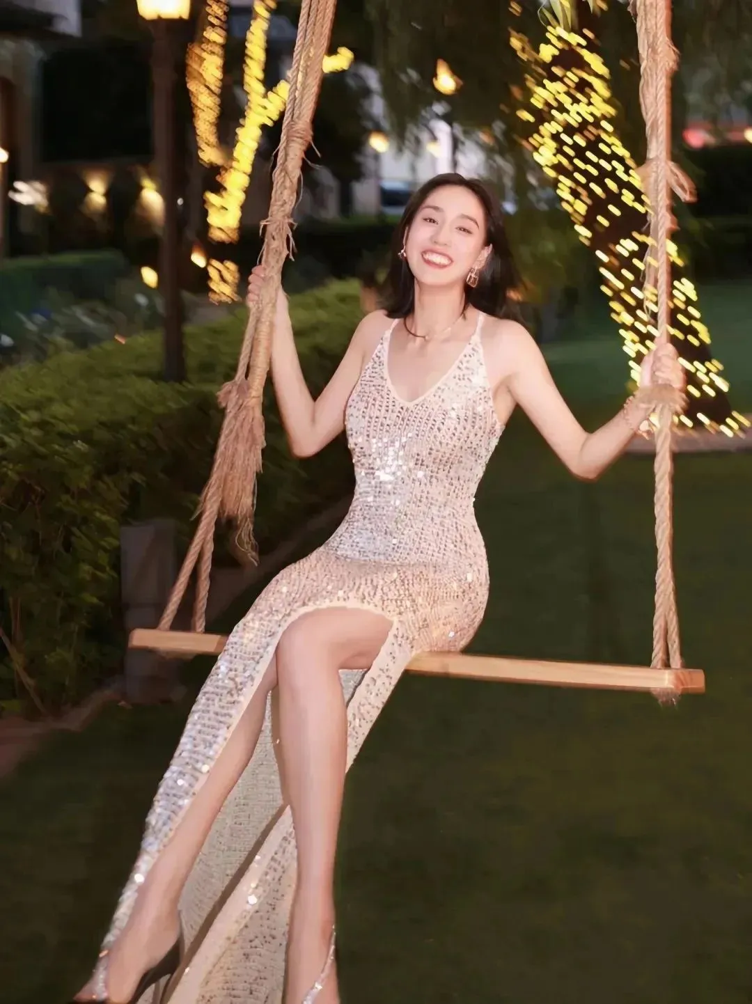 面料的选择更是点睛之笔。闪亮的装饰元素在灯光下熠熠生辉,随着她的移动折射出万千光芒,宛如将整条银河披在身上。这种设计不仅凸显了她的身材优势,更营造出一种高级而神秘的氛围。