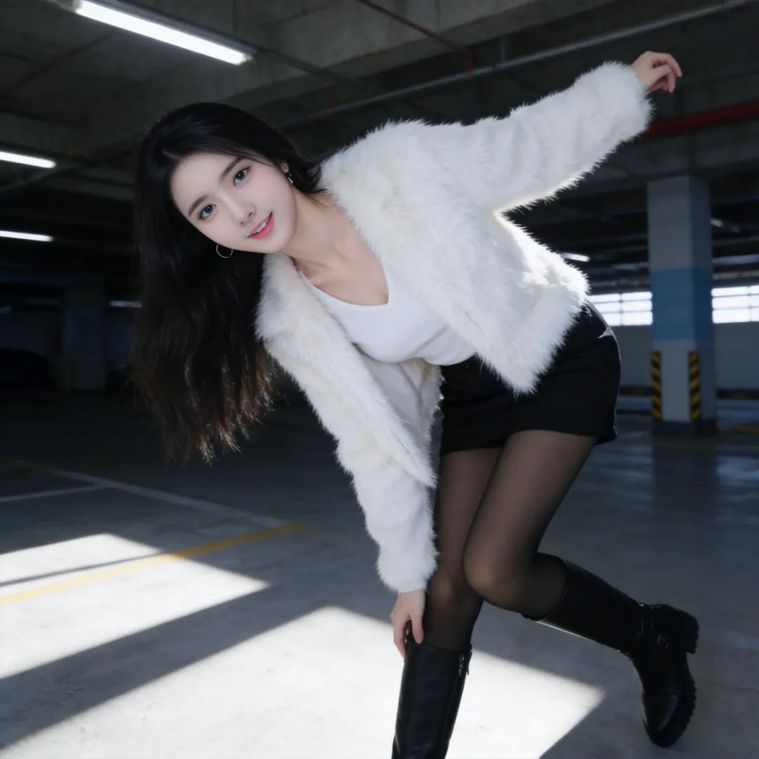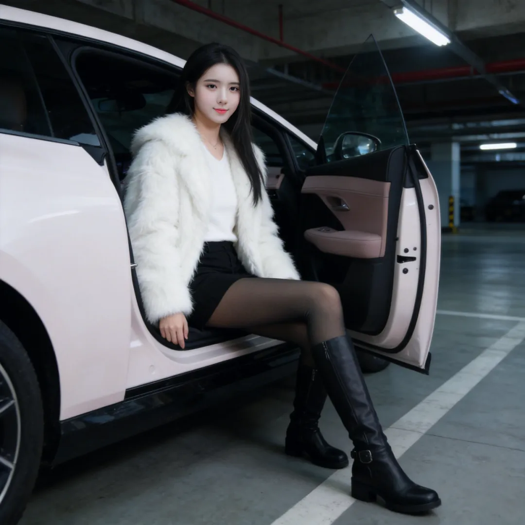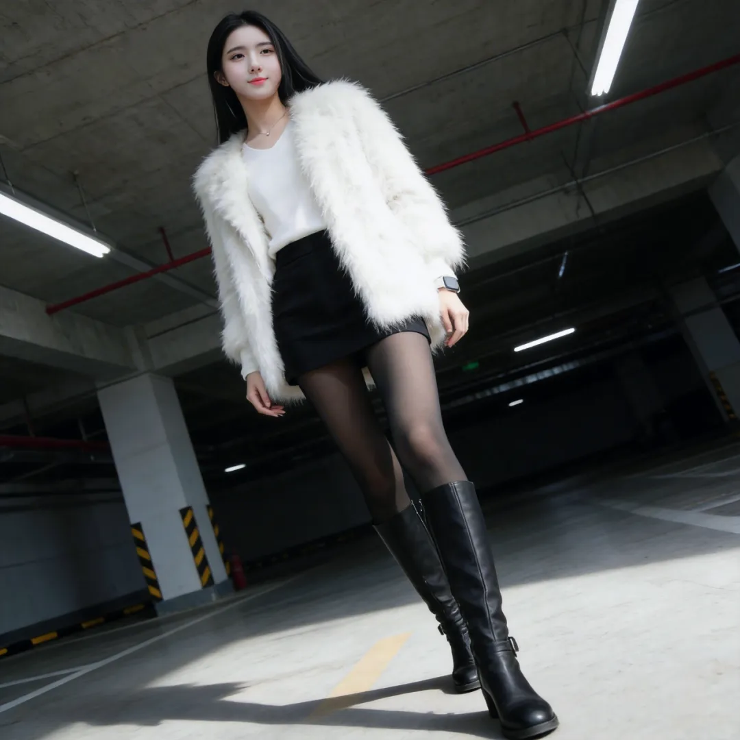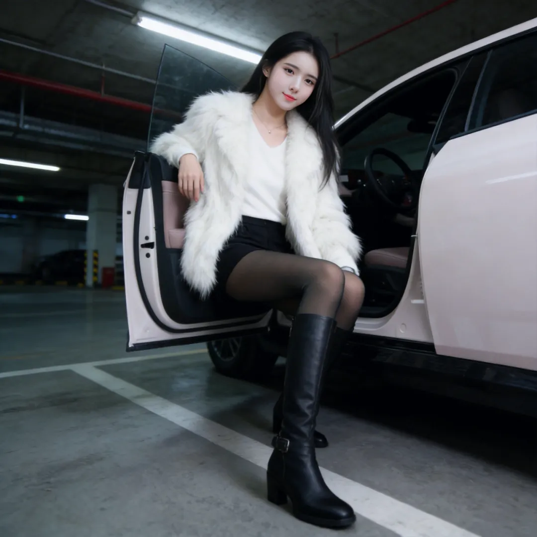 地下车库的冷调灯光下,混凝土墙面泛着青灰色的光泽,轮胎与地面摩擦的声响在空旷空间里回荡。这里本是机械与速度的领地,却因一双长靴的介入,衍生出令人屏息的时尚叙事。长靴不再是冬季的保暖符号,而是化身都市女性征服空间的战靴,在水泥森林里踏出铿锵的节奏。