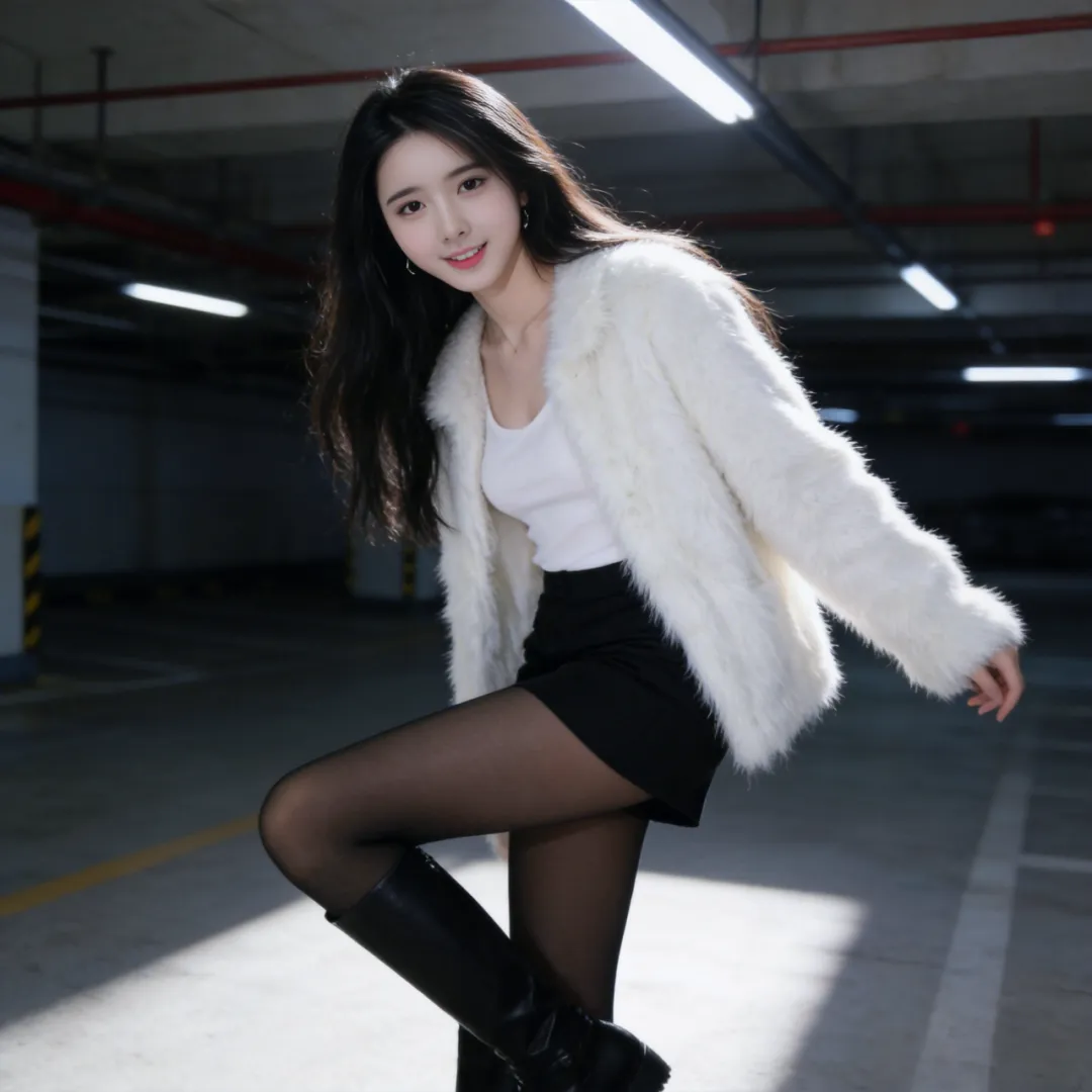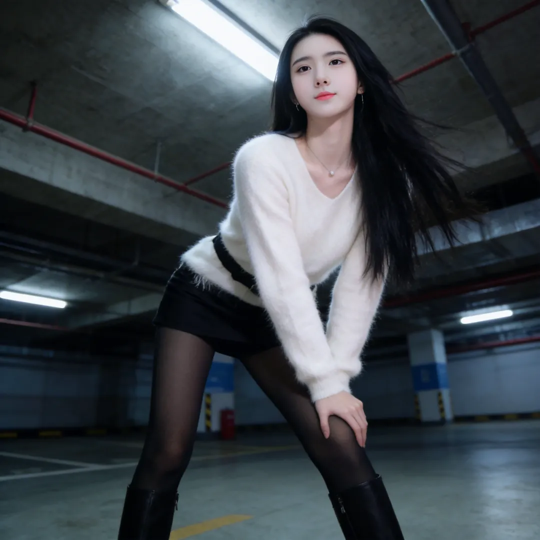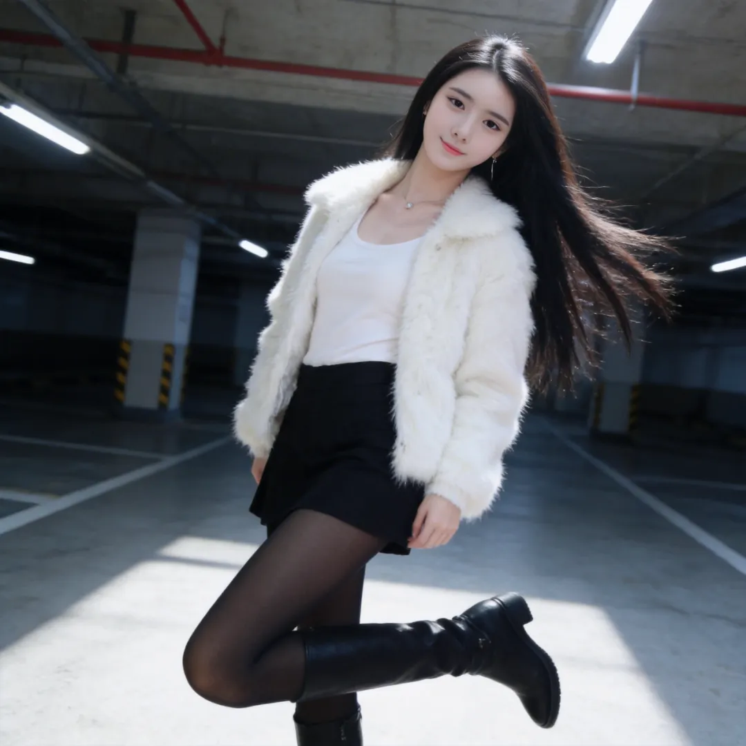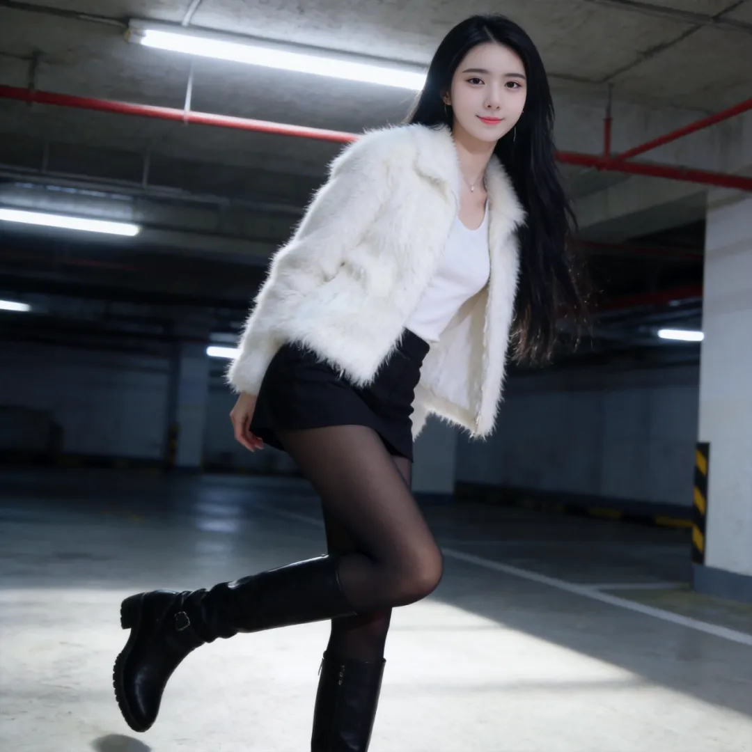 地下车库的冷调灯光下,混凝土墙面泛着青灰色的光泽,轮胎与地面摩擦的声响在空旷空间里回荡。这里本是机械与速度的领地,却因一双长靴的介入,衍生出令人屏息的时尚叙事。长靴不再是冬季的保暖符号,而是化身都市女性征服空间的战靴,在水泥森林里踏出铿锵的节奏。