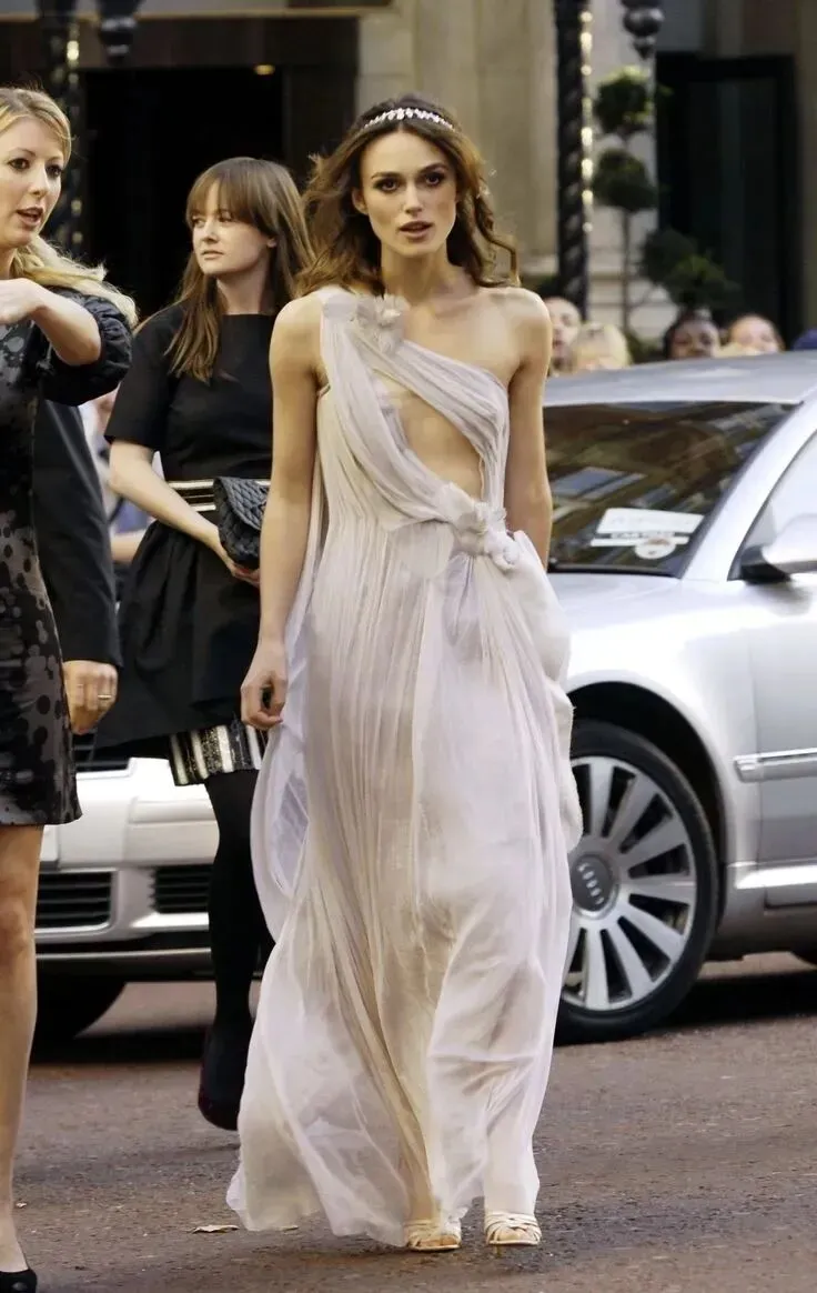 2007年《赎罪》伦敦首映,奈特莉穿着薄纱裙如女神降临,大方展示平坦的胸部,美得石破天惊。这一形象被视为对传统审美的挑战和突破。