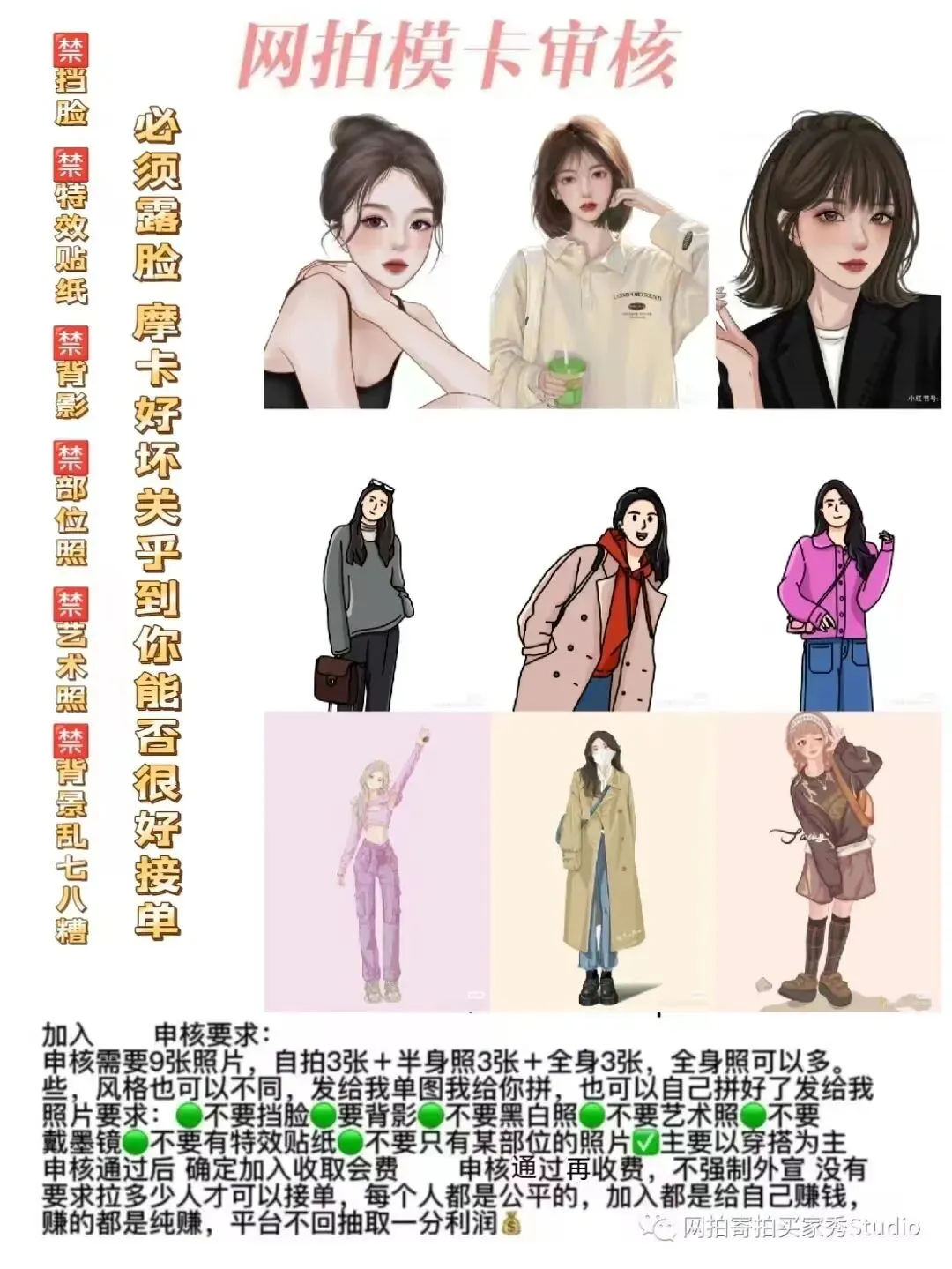基本要求:露全脸,自拍照、半身照、全身照都要有,可以p图,可以美颜