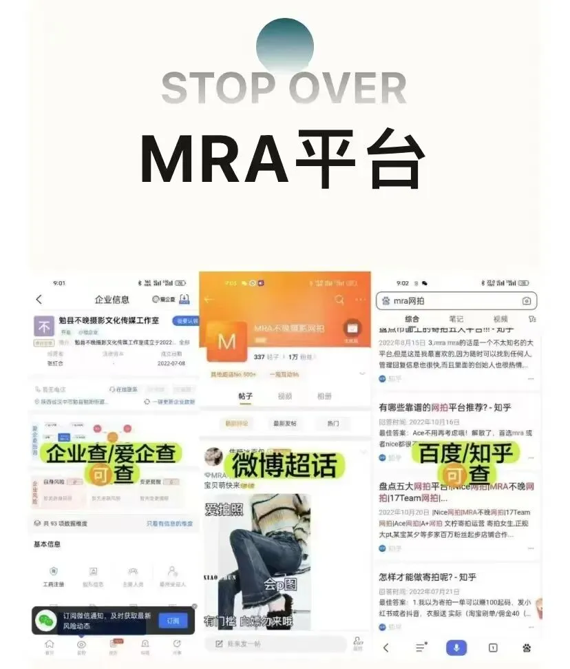 以MRA不晚网拍平台为例,这个平台就是有营业执照,天眼查和爱查企都能查,百度微博有认证,对于学生党还能开实习证明,每天都能接单且接单无上限
