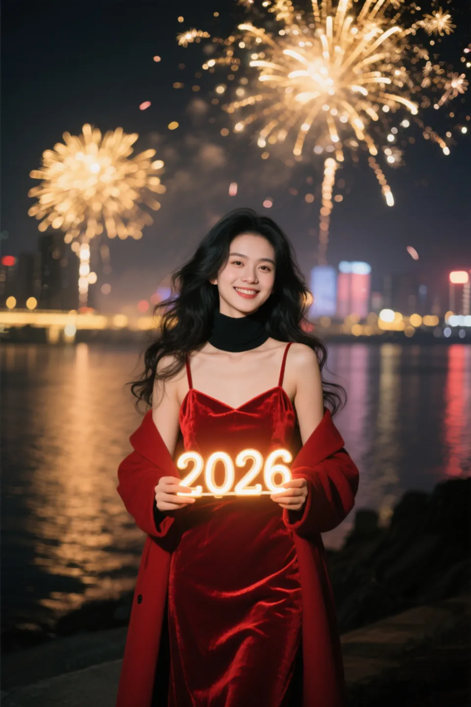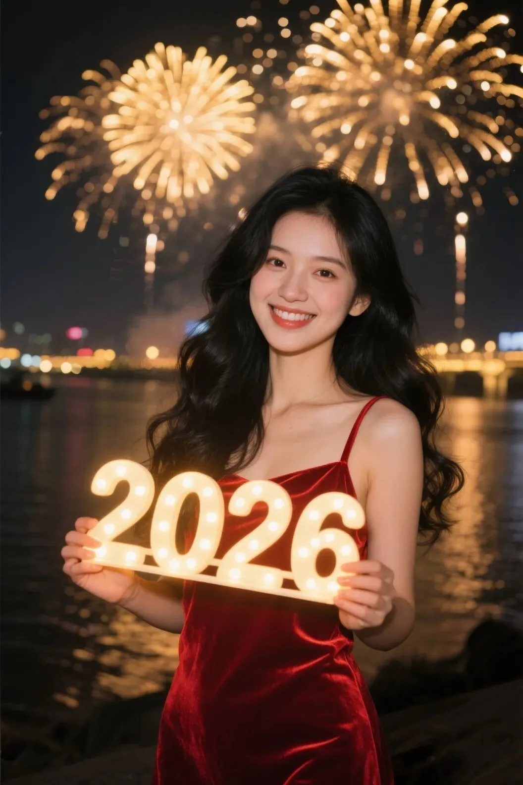 2026新年烟花夜景写真,年轻女生,黑色长卷发,温柔浅笑,红色丝绒吊带裙,手持发光“2026”数字牌,漫天金色烟花,江边夜景,暖调光影,发丝发光,高清8K,胶片质感