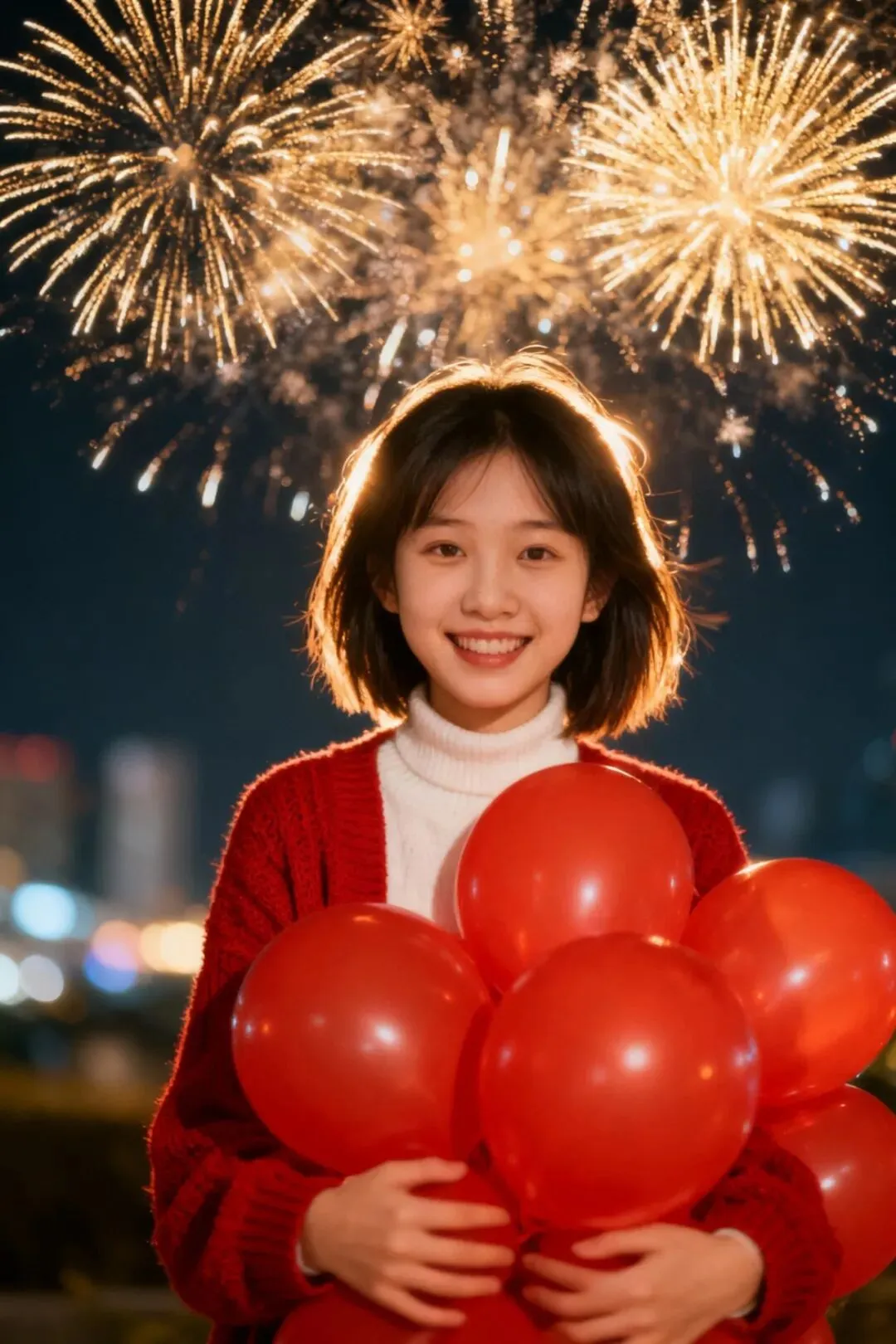 还有这张,烟花下抱着红色气球笑的,发丝都带着暖光,谁看了不说一句“美疯了”!